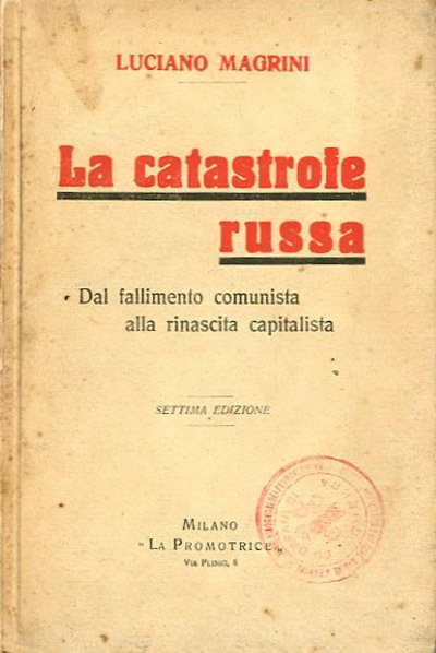 7. ed. 218 p. ; 19 x 13 cm. Luciano Magrini, repubblicano e giornalista, nell'esercitare la professione venne influenzato dalla formazione mazziniana che lo portava a interessarsi delle classi più disagiate e a prenderne le parti; del resto non fu certamente un inviato "da salotto", ma anzi seguì le notizie laddove altri non osavano. Ne sono testimonianza gli articoli e i libri in cui raccolse i resoconti di guerra o di viaggio, per esempio quelli relativi allo scontro tra Grecia e Turchia nel corso della crisi balcanica del 1912-13, cui partecipò anche come combattente in favore della causa greca. Durante la Prima guerra mondiale, unico giornalista, seguì la ritirata delle truppe serbe (autunno 1915) e le sue corrispondenze furono pubblicate anche dai giornali inglesi (poi raccolte in «La Serbia invasa». 1922); dai due viaggi compiuti in Russia dopo la Rivoluzione d'ottobre e dalle relative corrispondenze trasse: «Nella Russia bolscevica (maggio-giugno 1920)» [1920] e «La catastrofe russa. Dal fallimento comunista alla rinascita capitalista» [1922] esprimento in tutte le due opere le sue critiche repubblicane all'esperimento comunista. Brossura editoriale, coperta in cartoncino flessibile con titolo impresso in rosso al piatto e al dorso. Segni del tempo alla coperta, al taglio e alle pagine interne (ingiallimento della carta), per il resto libro in buono stato, intonso. Codice libreria 4832.