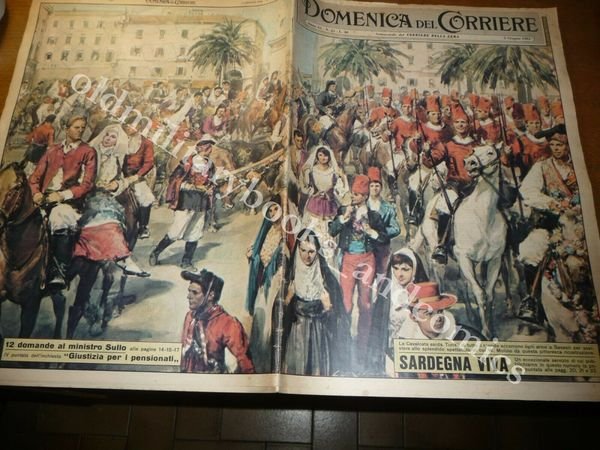 DESCRIZIONE: Domenica del Corriere, Milano, Anno 63 n. 23 (3 GIUGNO 1961). COPERTINA: La cavalcata sarda. Turisti di tutto il mondo accorrono ogni anno a Sassari per assistere allo splendido spettacolo. Disegno su doppia pagina che prosegue anche al retro. Articolo all'interno. RETRO: La Domenica del Corriere è stato un popolare settimanale italiano fondato a Milano nel 1899 e chiuso nel 1989. Apparve per la prima volta nelle edicole l'8 gennaio 1899 come supplemento illustrato del Corriere della Sera. Stampata in grande formato (sul modello del domenicale La Tribuna illustrata), aveva 12 pagine e veniva distribuita gratis agli abbonati del Corriere, oppure si poteva acquistare in edicola per 10 centesimi. La prima e ultima di copertina erano sempre disegnate. Il Corriere si avvaleva di un giovane disegnatore, Achille Beltrame, allora sconosciuto, a cui veniva affidato in ogni numero il compito di rendere con la sua tavola il fatto più interessante della settimana. Dopo la sua morte nel 1945, fu sostituito da Walter Molino che, come il suo predecessore, firmò memorabili copertine. A differenza dei settimanali dell'epoca, la Domenica del Corriere diede ampio spazio alle fotografie e ai disegni, e questo fu uno dei motivi del suo successo. CONDIZIONI: Ottime. PESO / WEIGHT: 200 gr. without package