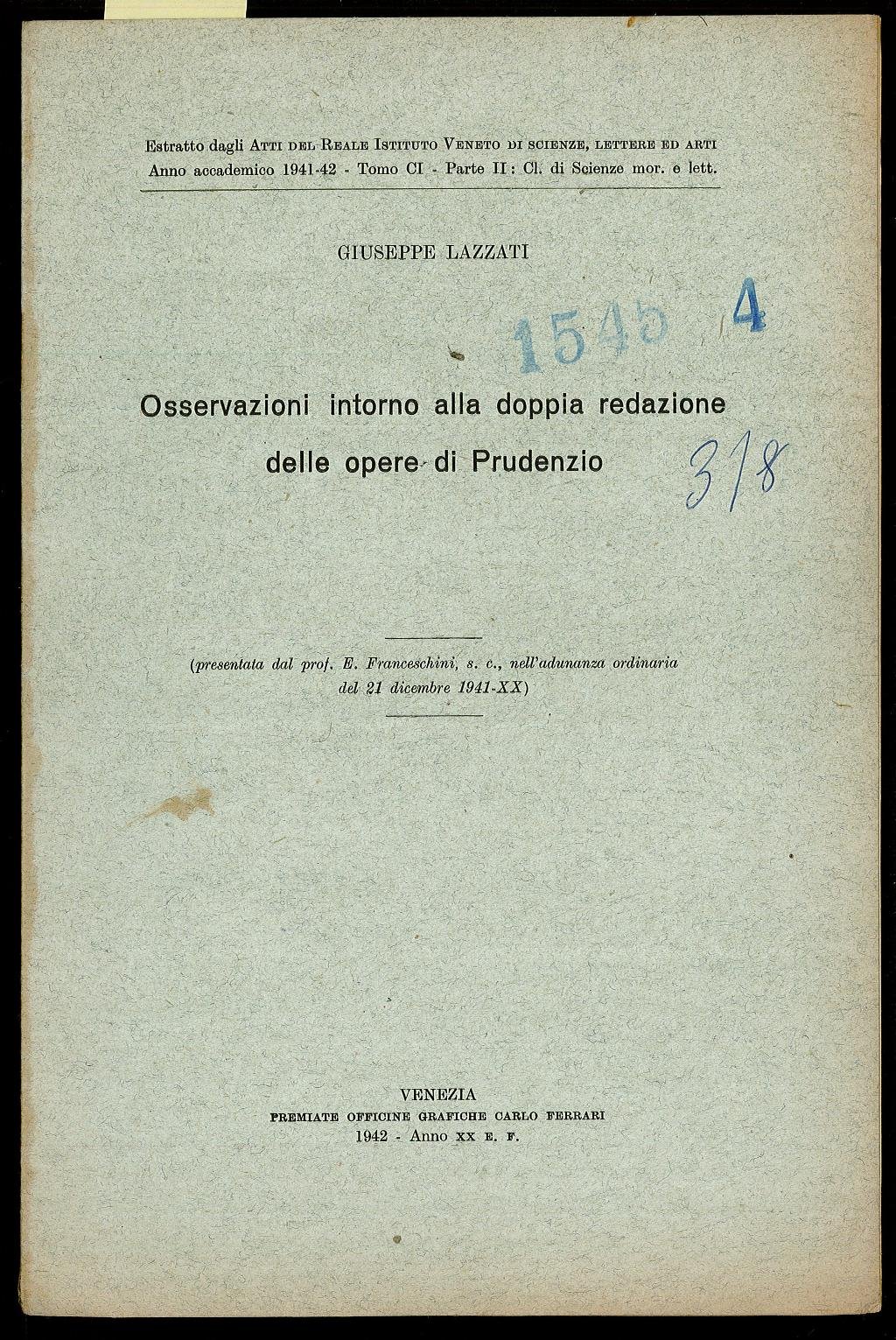 Opuscolo Vintage. Relazione del Prof. Ussani Vincenzo. Nota a biro in copertina. Piega centrale. Ordinario segno del tempo.