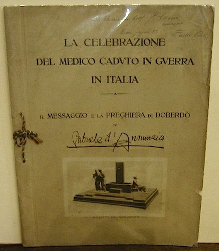 4to (cm. 34), 16 cc.nn. Copertina avana a stampa nera con cordoncino tricolore e un’incisione raffigurante il bozzetto del monumento al Medico caduto in guerra. Carta a mano con barbe. Edizione fuori commercio. Contiene: il Messaggio in facsimile d’autografo, datato Eremo di Cargnacco 28 febbraio 1923, inviato al generale della Valle; La Preghiera di Doberdò, datata Settembre 1916; un Commento dell’autore del monumento Arrigo Minerbi; due disegni di Duilio Cambellotti. Ottimo esemplare con dedica in copertina ’Al chiarissimo Prof. G. Panni. Roma, Giugno 23F. Della Valle’ e, al frontespizio, altra dedica ‘Al Cav. Luigi Pozzi in omaggio il Comitato. Giugno 1923. Omaggio’. De Medici, 115; Guabello, 281; Vecchioni, 74.