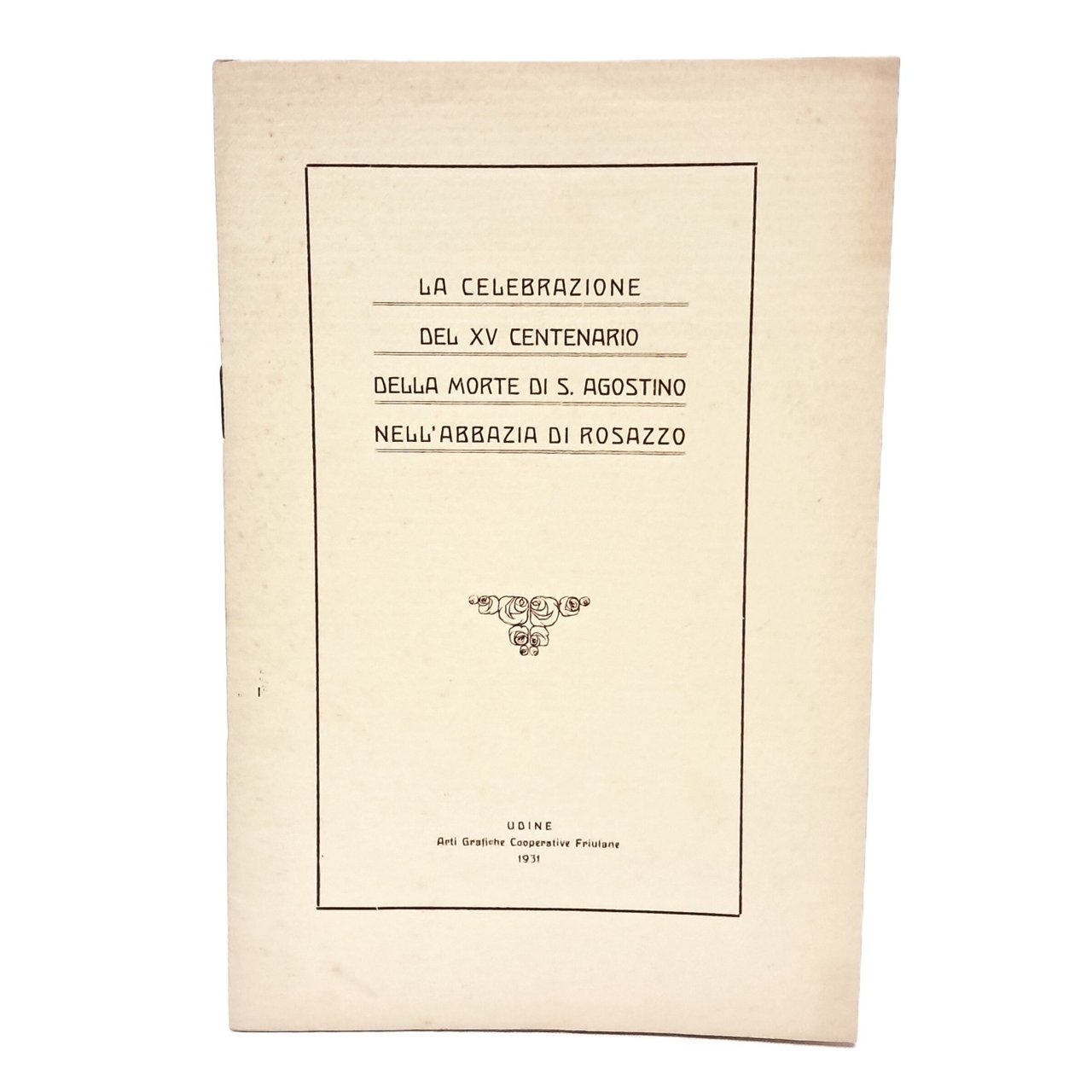 PRIMA EDIZIONE, pubblicazione in occasione del XV centenario della morte di S. Agostino Cenni storici dell'abbazia di Rosazzo, una relazione sulla visita di Vittorio Emanuele III e dei Duchi d'Aosta, dialogo in friulano di Zaneto. In brossura. Pp. 28. Foto fuori testo. Ottime condizioni.