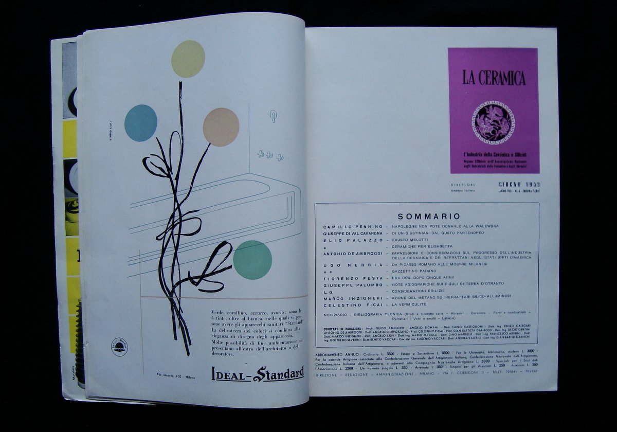 Rivista, LA CERAMICA" L'industria della Ceramica e Silicati Rivista Mensile anno VIII N° 6 - Giugno 1953 Milano, 1953, cm 29,5x21,5; pag. 74. Brossura ed. ill. a colori. All'interno pagine pubblicitarie non numerate e molte illustrazioni fotografie in b. e n. e a colori Numero completo. Condizioni di conservazione Esemplare in buone condizioni con leggere tracce d'uso e del tempo; cuffie con strappetti e piccole mancanze, margini ed angoli con minuscoli strappetti ai margini, interni buoni. Numero completo. RVS001N00212 blu "