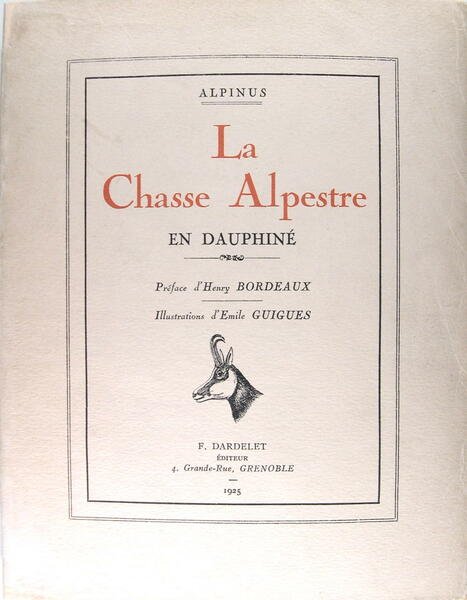 Editeur, Grenoble, 1925. In/4 broché, couverture imprimée en noir et rouge avec petite vignette centrale, 306 pages, illustrations in et hors texte dont 1 frontispice d'Emile Guigues, préface d'Henry Bordeaux, (photographie de Faige Blanc). Couverture doublée. Un ouvrage pour les vrais amoureux de la montagne. Dans ces pages exquises, Alpinus révèle les charmes et la beauté de la nature alpestre, sur la piste des chamois, du coq de bruyère, de l’ours. Thiébaud, 366.