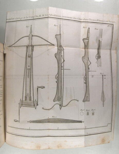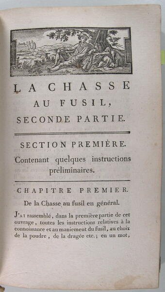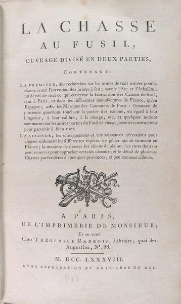 A Paris, chez Théophile Barrois, 1788. Fort volume in/8 reliure de l'époque, pleine reliure dos orné, dos lisse à pièce de titre, 582 pages, 5 ff, 9 planches dont 8 planches in-fine, supplément : 111 pages - In fine la chasse au loup de Clamorgan plaquette 1598, 19 pages, 5 bois, (incomplet manque de la page 11 à 16). Des recherches sur les armes de trait usitées pour la chasse avant l’invention des armes à feu (arc et arbalète), fabrication des canons de fusil, marques des cannotiers de Paris, les connaissances pour chasser utilement les espèces de gibier, la manière de dresser les chiens de plaine, les ruses pour approcher certains oiseaux. Le nom de l’auteur se lit dans l’approbation et le privilège. Ce livre est non seulement le premier ouvrage français consacré exclusivement au fusil de chasse et à la chasse à tir, mais c’est aussi le premier traité de chasse qui consacre une étude importante à la “Sauvagine”. Thiebaud col. 621.