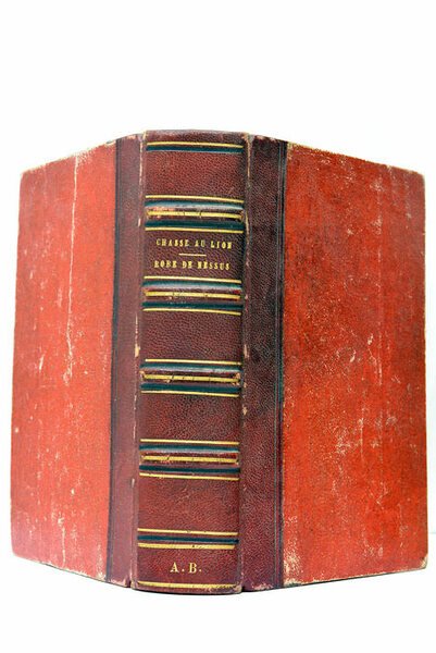 1). 254 pages. 1 feuillet. 2). 1 feuillet. 316 pages. (16x10 Cm). Demi-cuir rouge. Dos à nerfs doré. Coins et coiffes emoussés. Plats frottés. Rousseurs et taches. Deux ouvrages très differents assemblés en un volume. La Chasse au lion est plutôt un traité des différentes manières de chasser le lion, suivi d'études sur les principales chasses d'Algérie. Pour le deuxième ouvrage il s'agit d'une histoire romantique inspirée de la mythologie grécque. Le premier livre est illustré par de nombreux dessins pleine-page de scènes de chasse.