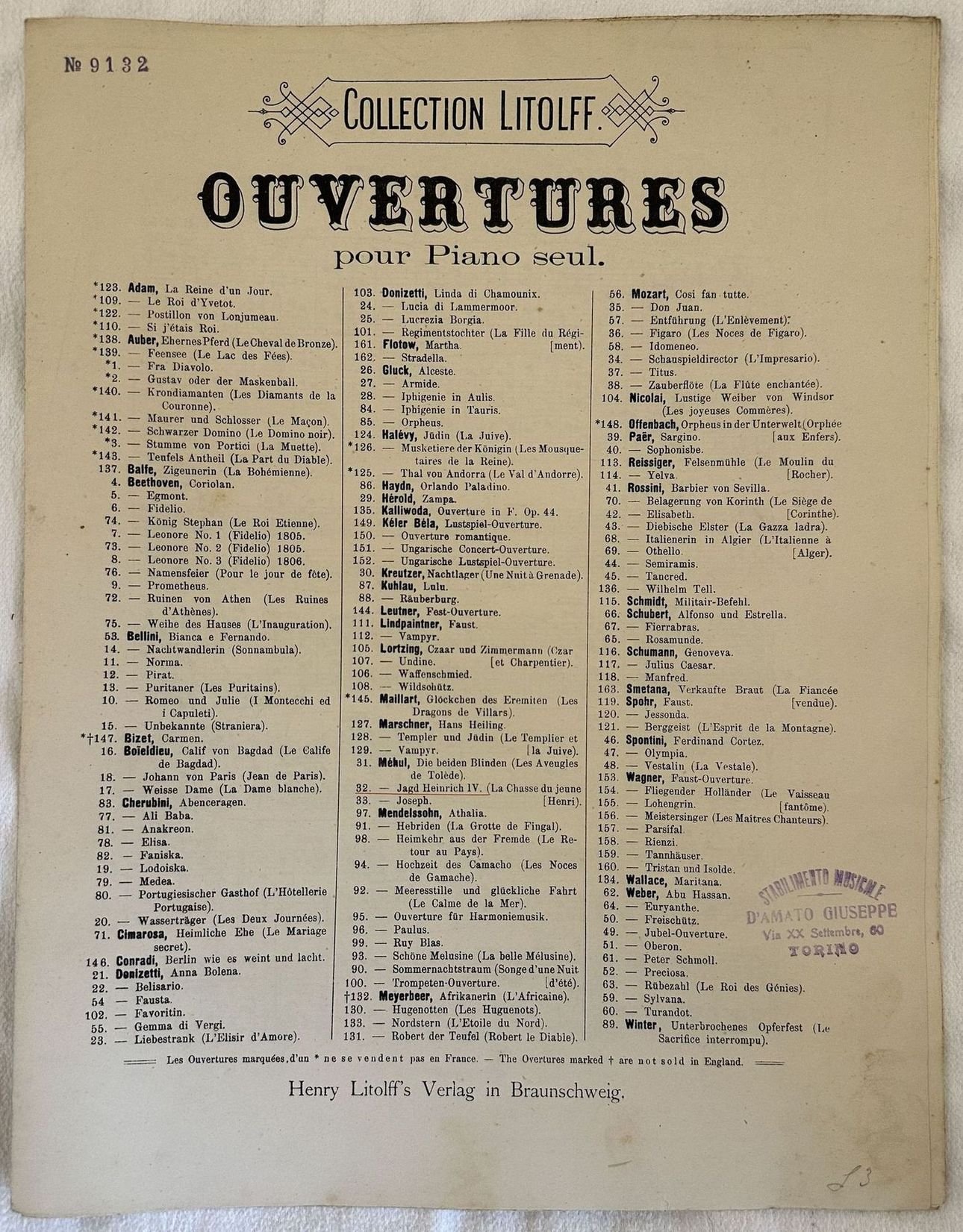 Edizione di inizio novecento della melodia "La chasse du jeune Henri" dall'opera "Jagd Heinrich IV" di Etienne Mehul (1763-1817) In ottime condizioni Copertina editoriale in ottime condizioni con lievi usure marginali. Legatura editorialmente assente. Pagine in ottime condizioni con rare fioriture.In folio. cm. 35x27. Pp. 9.Edtion of early 20th century of the melody "La chasse du jeune Henri" from the opera "Jagd Heinrich IV" by Etienne Mehul (1763-1817). In very good conditions Editorial cover in very good conditions lightly worn in the extremities. Binding is editoriarly missing. Pages in very good conditions with occasional foxing. In folio. cm. 35x27. Pp. 9.