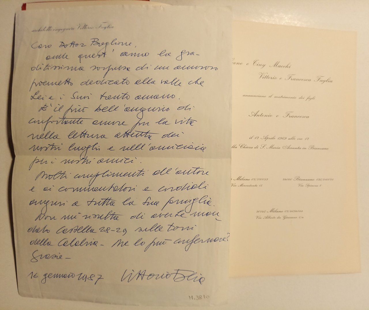 Volume impresso "in 800 esemplari di cui le copie in edizione speciale per gli sposi numerate dall'1 al 400, quelle in edizione normale dal 401 all'800" (edizione speciale per gli sposi, n. 303). Indice: schema localizzazione della chiesa in nero - annuncio del matrimonio di Antonio e Francesca; dei genitori Leone e Tiny Macchi-Vittorio e Francesca Faglia (12 aprile 1969, ore 12, presso la Chiesa di S. Maria Assunta in Bianzano. Vittorio Faglia è l'autore di parte delle fotografie riportate in questo volume, v. sotto) - La Santa Messa del 12 april 1969 (celebrante: Don Lorenzo Grigis Parroco di Bianzano) - La Chiesa di S. Maria Assunta in Bianzano (L'architettura; di Corrado Verga - Il complesso fantoniano dell'Altare; di Maria Verga Bandirali). In-8 grande, pp. XXII+46, bross., sovraccoperta in carta rossa applicata al dorso della brossura con al primo piatto le cifre in nero degli sposi (AF). Con 26 illustrazioni in b/n, escluso lo schema suddetto (v. indice). Rilievi: Beppe Longoni - Disegni: Michele Faglia - Fotografie: Matteo e Vittorio Faglia (padre della sposa, v. sopra), Neri e Gaviraghi, Giovanni Pedrocchi, Marini. A p. I dedica a penna blu di Vittorio Faglia, il padre della sposa e autore di parte delle fotografie del volume, datata 1984. Allegata una lettera dell'Arch. Ing. Vittorio Faglia (il padre della sposa e autore di parte delle fotografie del volume) a penna blu su carta intestata A4, datata 1987. Stato buono
