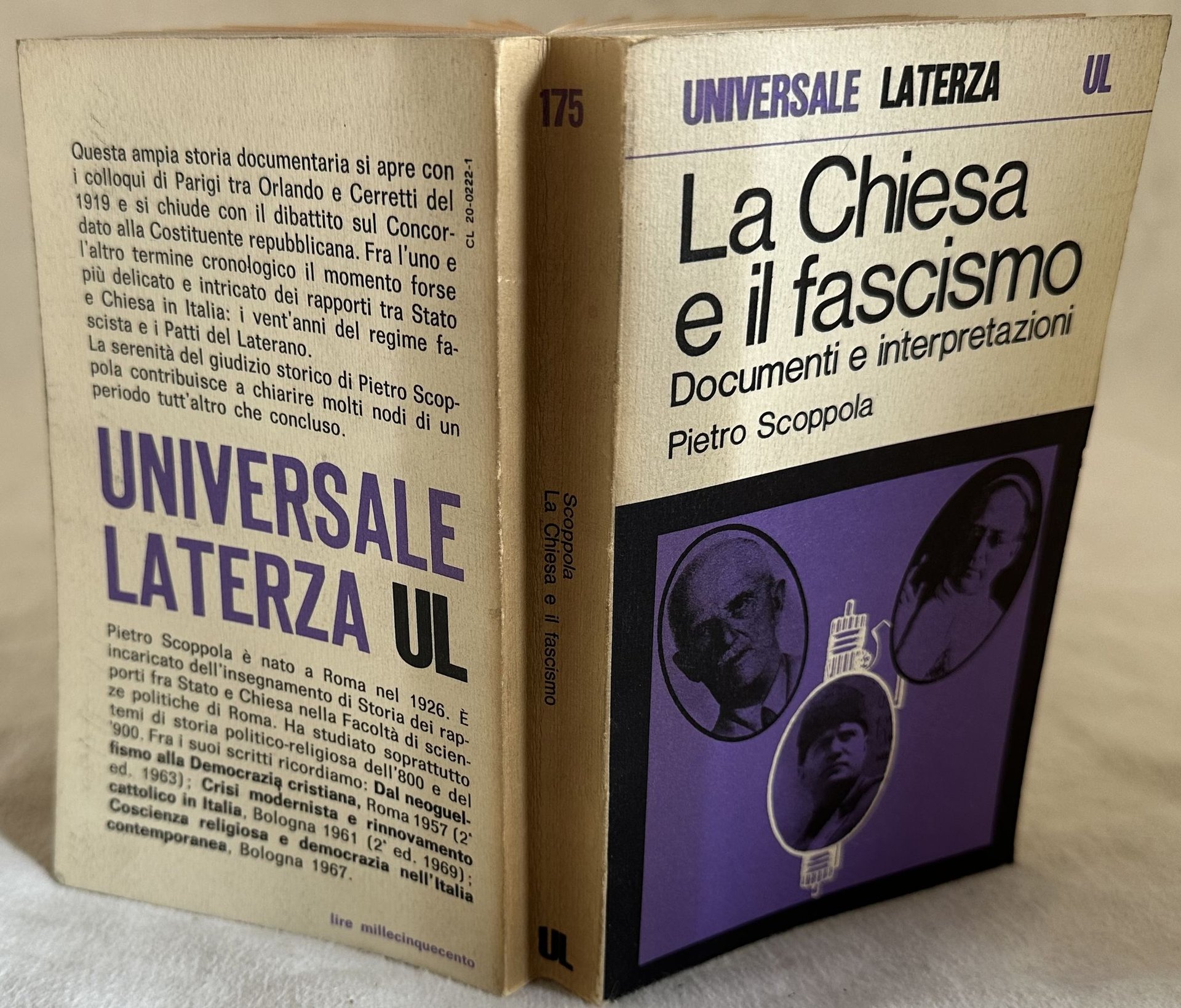 Edizione del 1971 di questa monografia sul rapporto tra Chiesa e fascismo scritta da Pietro Scoppola. "Questa ampia storia documentaria si apre con i colloqui di Parigi tra Orlando e Cerretti del 1919 e si chiude con il dibattito sul Concordato alla Costituente repubblicana". In buone condizioni. Copertina editoriale in buone condizioni con lievi usure ai margini e dorso. Macchie. Legatura in buone condizioni. Pagine in ottime condizioni con rare fioriture. In 16. cm 18x11 cm. Pp. XLIII+(1)+414+(6). Edition of 1971 of this monography about the relationship between Church and fascism written by Pietro Scoppola. "Questa ampia storia documentaria si apre con i colloqui di Parigi tra Orlando e Cerretti del 1919 e si chiude con il dibattito sul Concordato alla Costituente repubblicana". In good conditions. Editorial cover in good general conditions lightly worn in the extremities. Binding in good conditions. Inside pages are in very good conditions with occasional foxing. In 16. cm 18x11 cm. Pp. XLIII+(1)+414+(6).