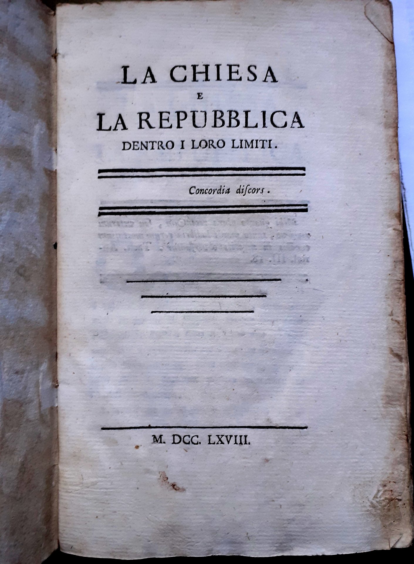 LA CHIESA E LA REPUBBLICA DENTRO I LORO LIMITI. CONCORDIA DISCORS., MDCCLXVIII.