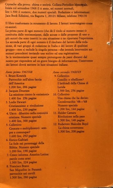 Soggetti: Chiesa, Cattolicesimo, Cristianesimo, Religione, Comunità cristiane, Stati Uniti, Libri rari, Libri Vintage, Società, Povertà, Ecumenismo, Liberazione, Emancipazione, Partecipazione, Coreo, Vietnam, Harlem, Parrocchiani, Fedeli, San Miguelito, Panama, Ortodossi, Battisti, Unione Sovietica, Russia, Unità, Comunione cristiana, Culti, Sette, Razzismo, Pacifismo, Ecclesia Christi, Diritti civili, Litanie, Anni Sessanta, Anni Settanta, Potere Nero, Emersione, Rito battesimale, Preghiera, Riti collettivi, Antologie, Scritti, Movimenti politici, Solidarietà, Cappellani, Preti, Open Housing, David Kirk, Alabama, Mississippi, Andy McGowan, Paul Moore, James Woodruff, Clandestini, Rivoluzionari, Clero, Gerarchie ecclesiastiche, Ufficiosa, Predicatori, Profeti, Giustizia sociale, Oppressi, Ultimi, Neri americani, Fuori catalogo, Church, Catholicism, Christianity, Religion, Christian communities, United States, Rare books, Society, Poverty, Ecumenism, Liberation, Emancipation, Participation, Parishioners, Faithful, Orthodox, Baptists, Soviet Union, Unity, Christian communion, Cults, Seven, Pacifism