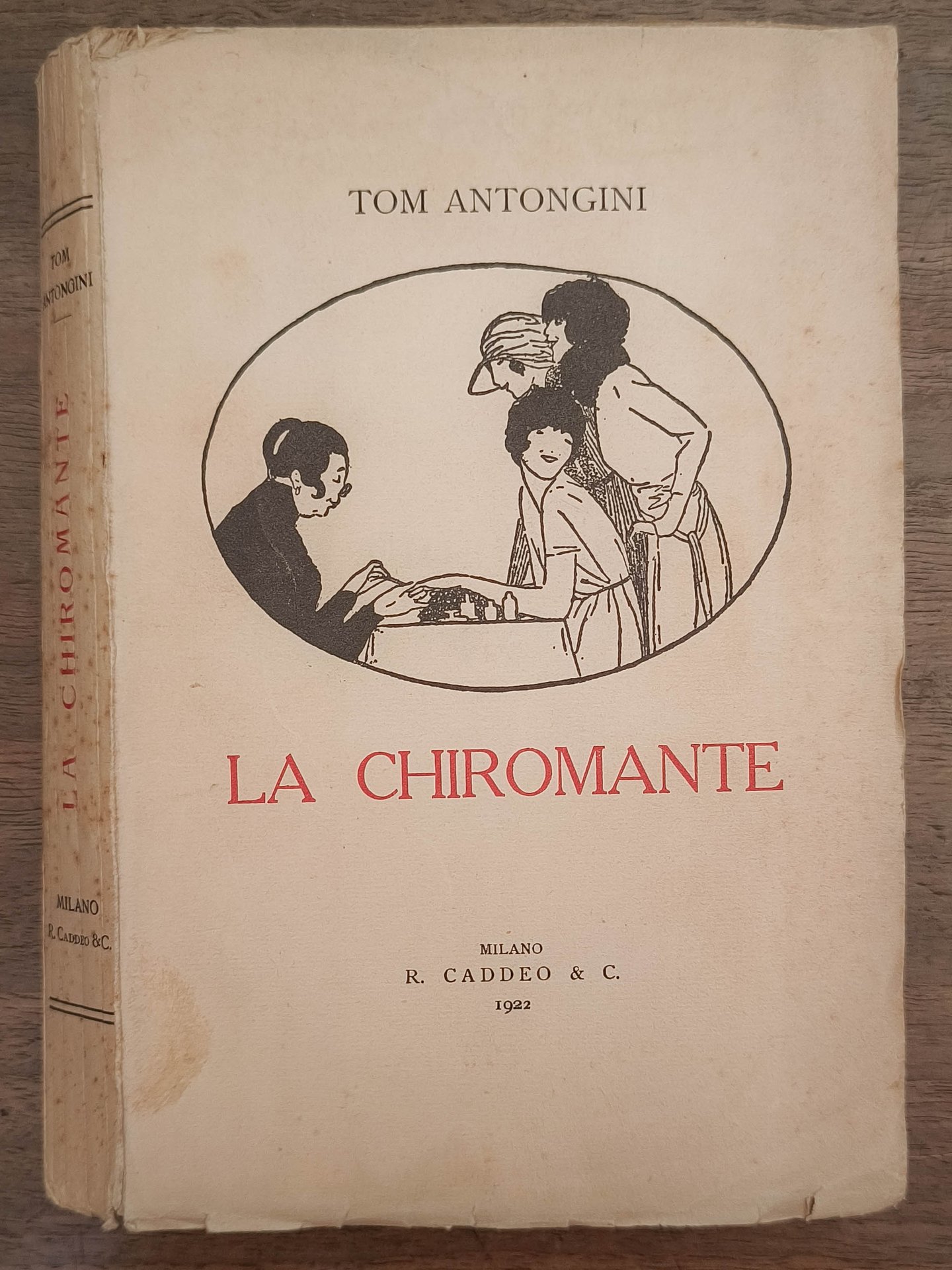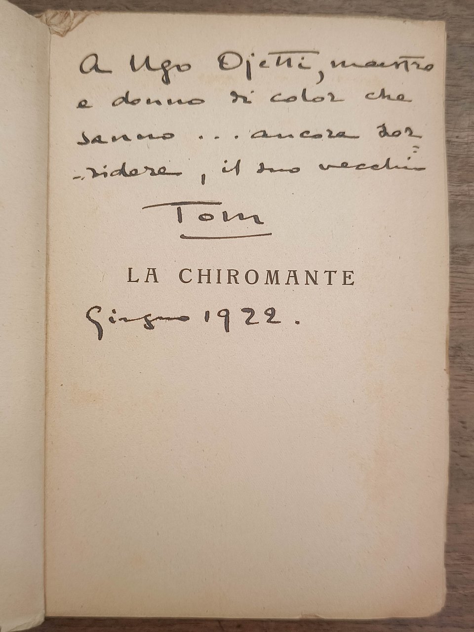 La chiromante, Milano, Caddeo, 1922. Prima edizione. Cm 18,7. Pp. 294 (1). Brossura editoriale illustrata. Macchie d'umidità sparse. Dedica dell'autore all'occhiello. "A Ugo Ojetti, maestro e danno di color che sanno … ancora sorridere, il suo vecchio Tom Giugno 1922".