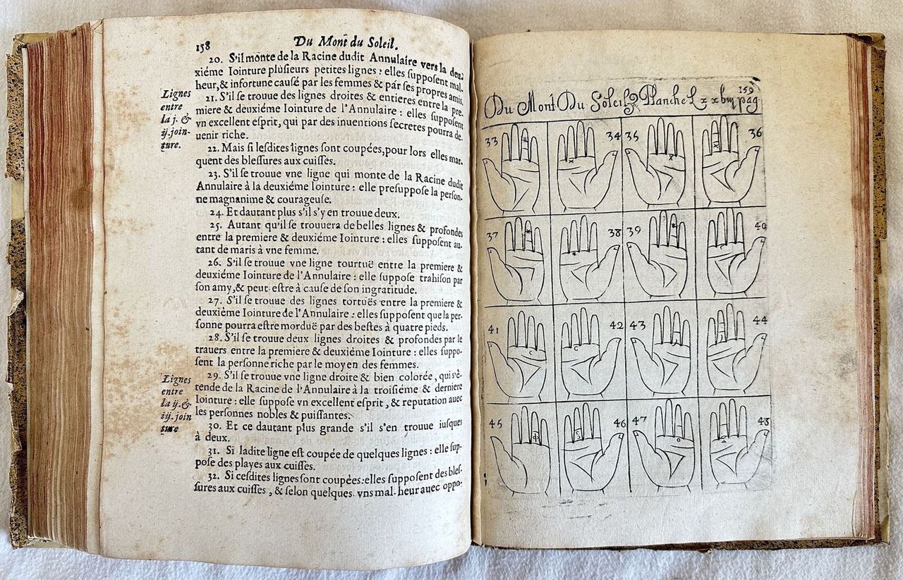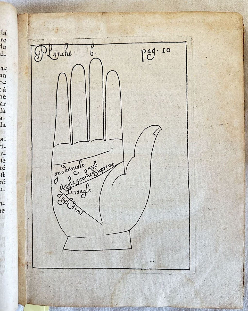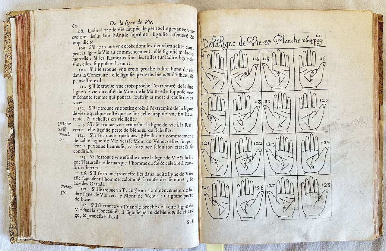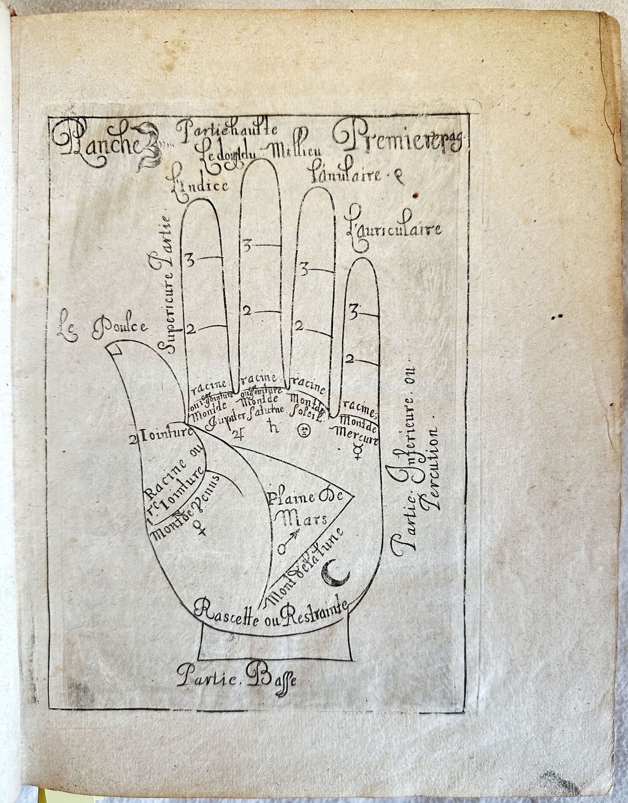 Edizione del 1682 di questo raro trattato di divinazione e chiromanzia pubblicato per la prima volta nel 1665. Autore anonimo ma attribuito da Krivatsy (Cf. 11671) all'astrologo belga Jean Tasnier (1508-1562). "Un de meilleurs traités de la chiromancie du XVIIe siècle" (Caillet). All'interno sono presenti 90 tavole a piena pagina che mostrano l'arte della chiromanzia. Ex libris al contropiatto anteriore. Antiche note manoscritte al frontespizio. In ottime condizioni. Copertina in piena pergamena settecentesca con titolo manoscritto al dorso in buone condizioni con lievi usure marginali. Legatura in buone condizioni. Pagine in buone condizioni generali con fioriture e lievi gore d’umidità. In 8. Dim. 22x18 cm. Pp. (8)+212+(90).Edition of 1682 of this scarce treaty of divination and plamestry published for the first time in 1665. Anonymous author but attributed to Krivatsy (Cf. 11671) to the belgian astrologian Jean Tasnier (1508-1562). "Un de meilleurs traités de la chiromancie du XVIIe siècle" (Caillet). Inside there are 90 full page plates featuring the art of palmestry. Ex libris in the front counterplate. Antique handwritten notes in the title page. In very good conditions. Full parchment cover of 18th century with handwritten title in the spine in good conditions lightly worn in the extremities. Binding in good conditons. Pages in good conditions with foxing and light dump stainsIn 8. Dim. 22x18 cm. Pp. (8)+212+(90).