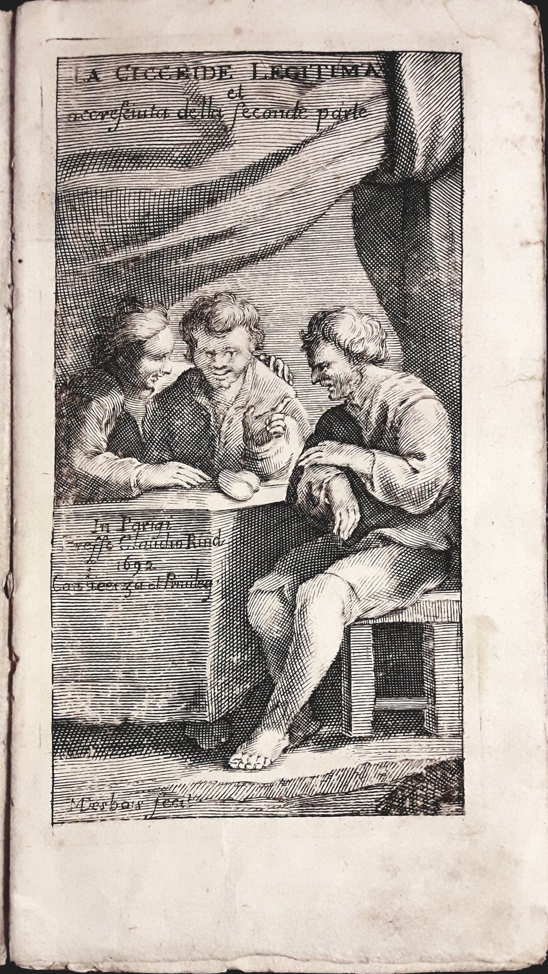 In 12°, (16,7x9,2 cm) p. 412. Frontespizio figurato, su cui compaiono un paio di testicoli e l'indicazione "M. Desboit fecit". Seconda edizione, ma la prima completa col titolo "La Cicceide legittima". Comprende 397 componimenti. Parte prima : Le Testicolate. Parte seconda: Le Sghignazzate. Ottimo esemplare a pieni margini. Legatura in cartoncino muto coevo. (Melzi, I, 205; Piantanida, 2931 "raro").