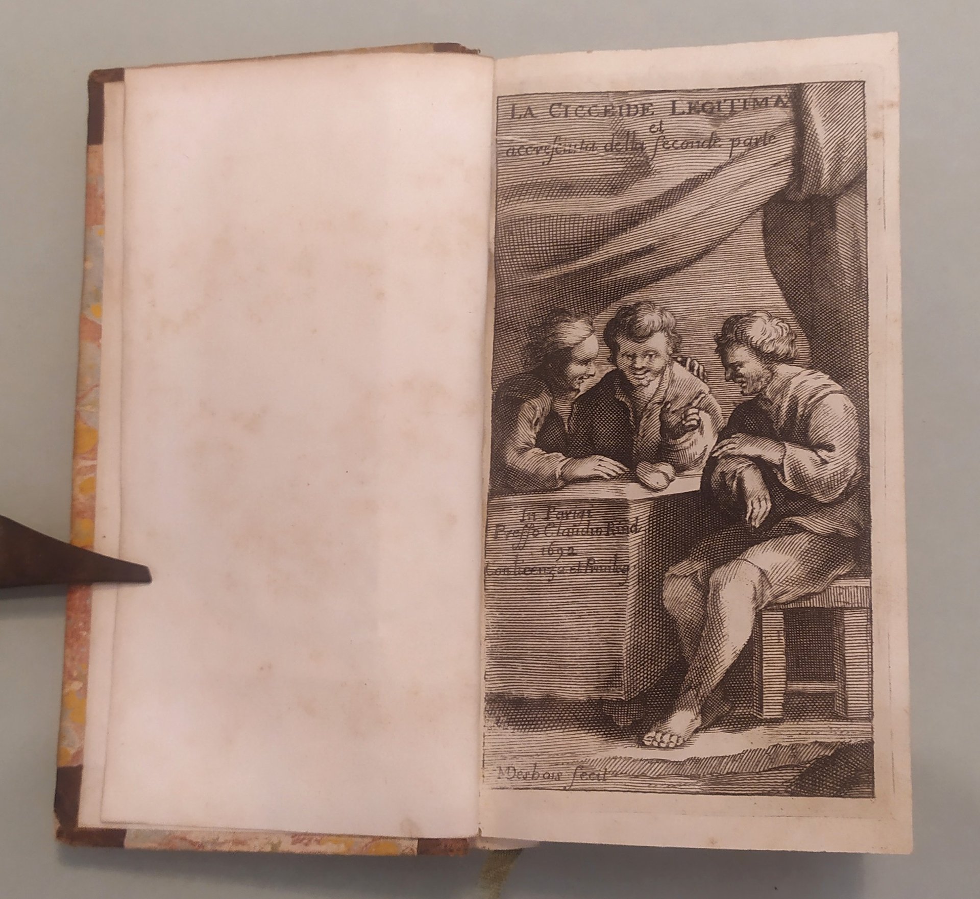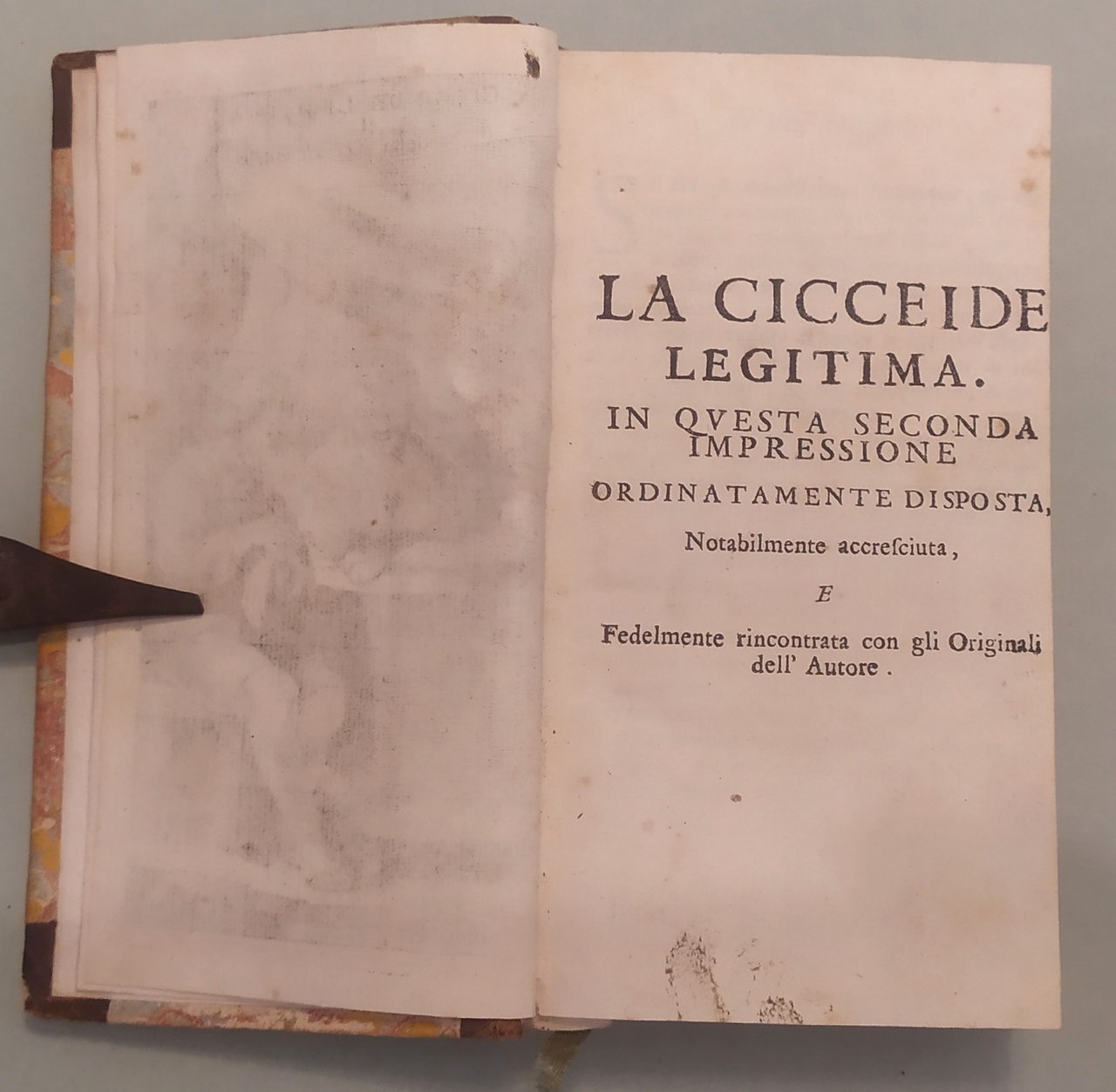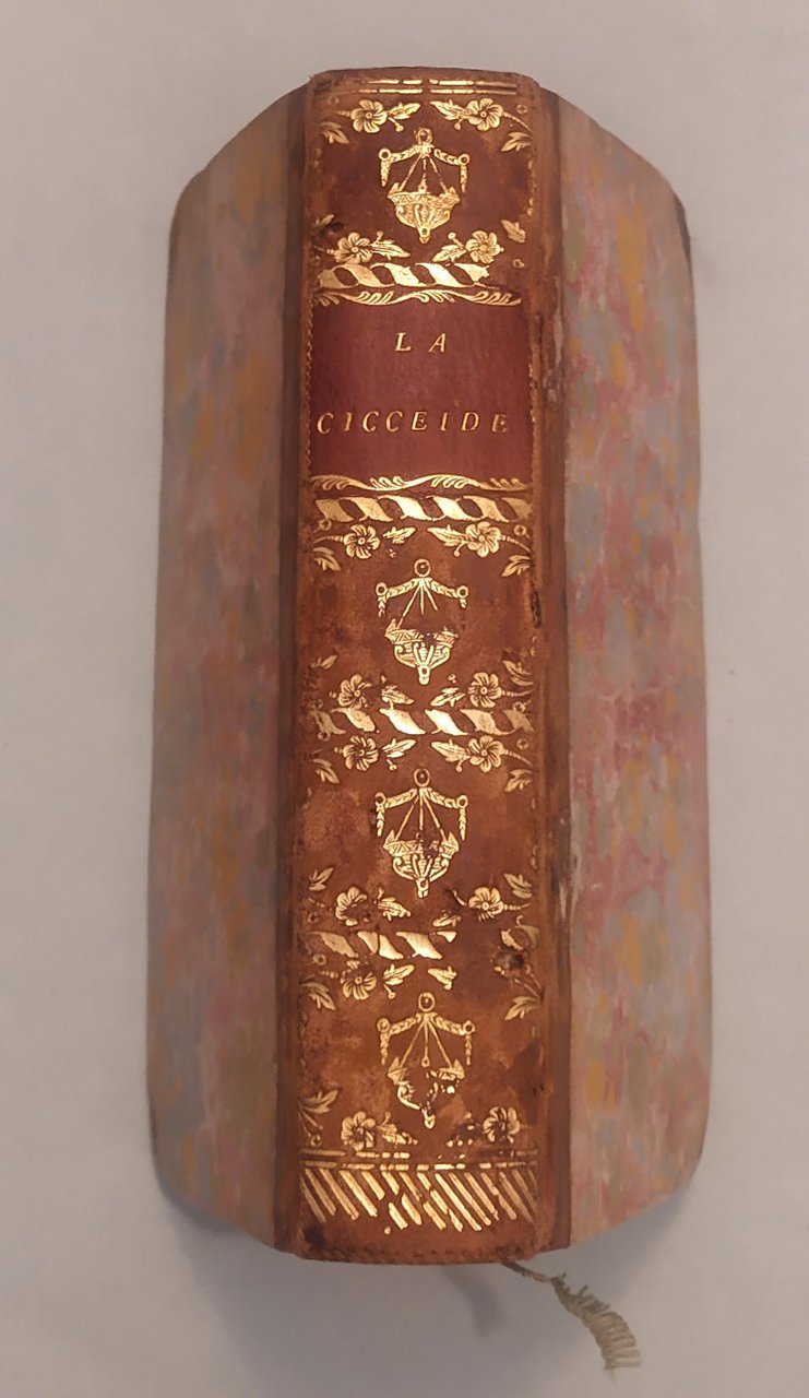 LA CICCEIDE legitima in questa seconda impressione ordinatamente disposta, notabilmente accresciuta e fedelmente rincontrata con gli originali dell’autore. Parigi, Riud, 1692; pp.412. Antiporta figurata incisa in rame. Unito: La Cicceide. In Cosmopoli. Senza note tipografiche né data; pp.156. Due opere in un volume in 16mo, la prima e la seconda edizione. Mezza pelle con angoli, tassello al dorso con titolo e fregi in oro. Capolavoro della letteratura burlesca e satirica, il cui obiettivo è quello di ridicolizzare un certo Arrighini da Lucca. Opera curiosa scritta in uno stile osceno. “La prima edizione, che presentava un luogo di stampa di mera fantasia, "Cosmopoli", ma probabilmente edita a Venezia, uscì senza il consenso dell'autore tra il 1687 ed il 1688. La seconda edizione è del 1692 e fu la prima con il titolo "La Cicceide legitima". Brunet II,5; Parenti, Luoghi di stampa falsi, pag.160: “E’ opera di G.F. Lazzarelli stampata a Venezia dall’Hertz”.