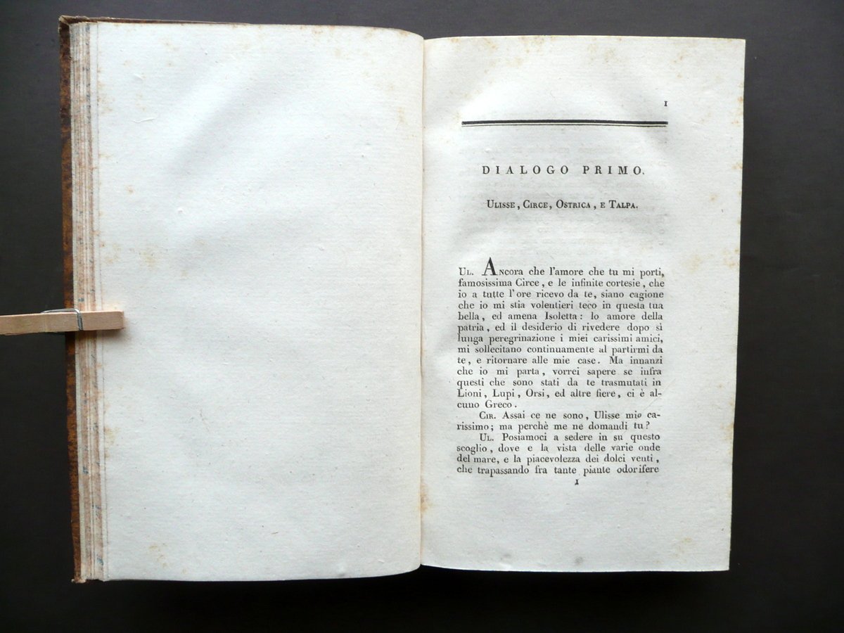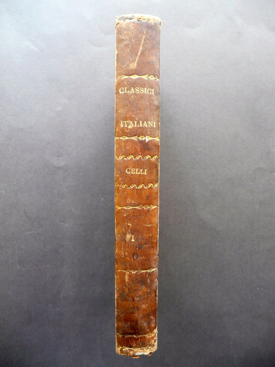 Giovanni Battista Gelli, La Circe di Giovanni Battista Gelli Accademico fiorentino Dalla Società Tipografica dei Classici Italiani, Milano 1804; cm 21x12,5; pp. XXVI-228, con un bel ritratto in b/n del Gelli inciso all'antiporta (vedi foto); legatura d'epoca in mezza pelle con titolo e fregi in oro al dorso, piatti marmorizzati, tagli colorati a spruzzo. Condizioni di conservazione Esemplare ben conservato con tracce d'uso e leggeri segni del tempo, coperta con alcune piccole leggere abrasioni e poche minuscole mancanze principalmente agli angoli dei piatti, alle cerniere e alle cuffie del dorso. Interni buoni con alcune piccole leggere bruniture. Volume autonomo e completo, corrispondente al primo delle opere del Gelli. SETT131.L13322 N
