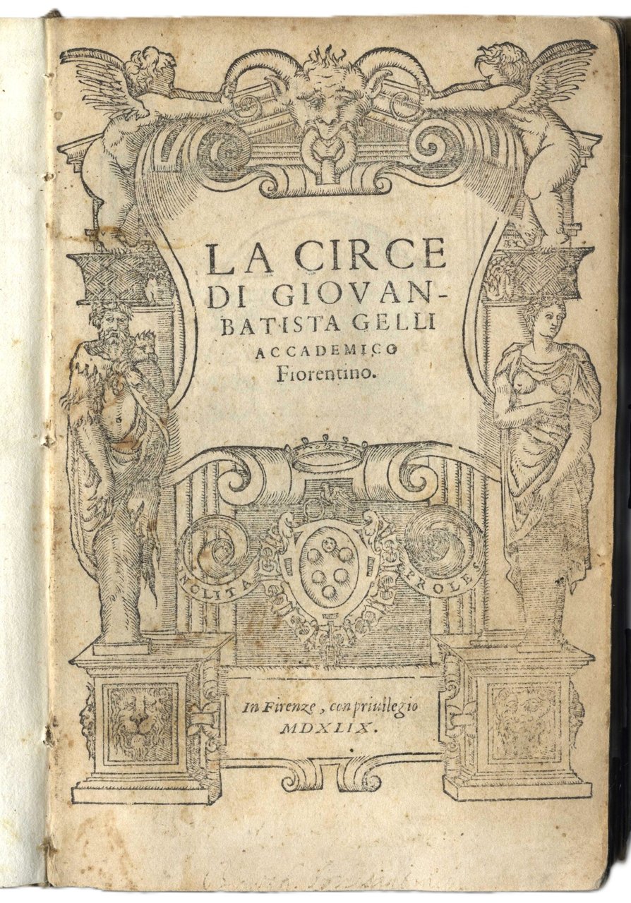>in-8 (165x105 mm), pp. 266, (6, il primo col colophon, gli altri bianchi), legatura coeva in pergamena, titolo ms. al dorso. Frontespizio figurato a motivo architettonico, al verso ritr. del Gelli in xilogr., una grande iniz. istor., testo in car. rom. Dedica dell'a. a Cosimo de Medici. Prima edizione di questa celebre e fortunata opera in dieci dialoghi, nella quale il Gelli "racconta che di undici greci, compagni di Ulisse, trasformati in bestie da Circe, il solo elefante, che s'era prima occupato di filosofia, consente a ridiventar uomo: gli altri, la serpe, la lepre, il capro, il cane, il cavallo, ecc. non vogliono. Il che significa che soltanto gli uomini fortificati dalla filosofia possono sottrarsi ai vincoli pressoché infrangibili della sensualità. Lucido, chiaro, giudizioso il pensiero, anzi talora così indipendente, che il secondo dialogo sull'immortalità dell'anima fu posto all'Indice; attraente la vicenda, anche per la rispondenza dei personaggi bestiali od umani con personaggi e situazioni della vita fiorentina del tempo; la forma limpida, spontanea, schiettamente fiorentina" (cfr. Renda-Operti, Diz. stor. letter. ital., p. 525). Bell'esemplare. Moreni, Annali Torrentino, p. 53: «raro libro di lingua». Gamba 491: «Assai rara». BMC 293. Adams G-333. D.B. It., vol. 53, pp. 12-8.