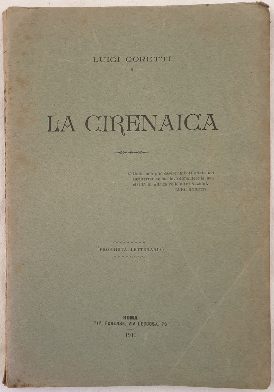 Edizione del 1911 di questo studio sulla Cirenaica scritto da Luigi Goretti. L'autore descrive l'economia e agricoltura della Cirenaica, Sudan Bengasi, Derna, Eremita di Nasr-el-Tin, Sidi Ahmed Er Rifi, movimento dell'Italia nei porti della Tripolitania, Libano ecc. Ampia parte dedicata alle imposte. Ritratto dell'autore in antiporta. Dedica dell'autore con firma al frontespizio. In buone condizioni. Copertina editoriale in buone condizioni generali con lievi usure ai margini e dorso. Legatura in buone condizioni. All'interno le pagine si presentano in buone condizioni con fioriture. In 8. Dim. 24,5x17 cm. Pp. 104. Edition of 1911 of this study about Cirenaica written by Luigi Goretti. The author describes the economy and agriculture of , Sudan Bengasi, Derna, Eremita di Nasr-el-Tin, Sidi Ahmed Er Rifi, movimento dell'Italia nei porti della Tripolitania, Libano ecc. Wide part dedicated to taxes. Portarit of the author in the frontspice. Dedication of the author with signature in the title page. In good conditions. Editorial cover in good general conditions lightly worn in the extremities.Binding in good conditions. Inside pages are in good conditions with foxing. In 8. Dim. 24,5x17 cm. Pp. 104<BR><BR>