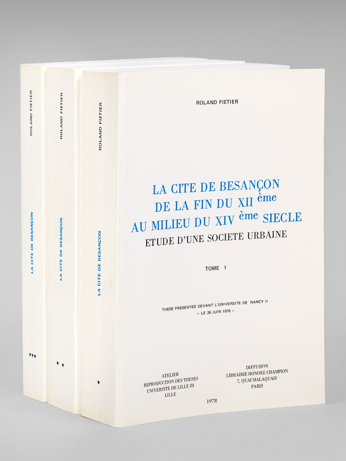 3 vol. fort in-8 br., Atelier Reproduction des Thèses, Université de Lille III, Lille, Diffusion Librairie Honoré Champion, Paris, 1978, 1720 pp. avec 5 cartes dépliantes Bel exemplaire en parfait état de ce travail fondamental sur le développement de la société bisontine entre la fin de la présence des Hohenstaufen en Bourgogne et la Peste Noire.