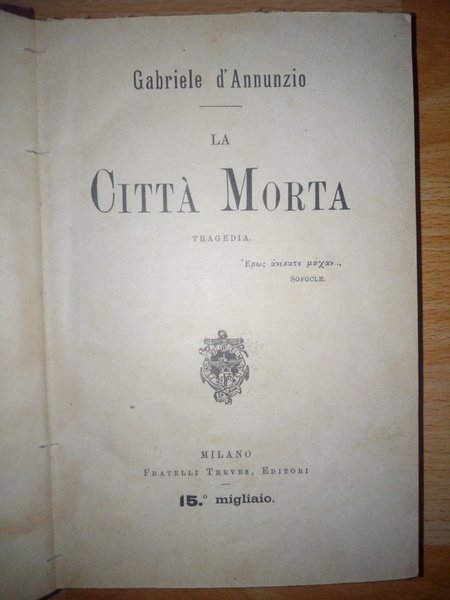 [D'Annunzio](cm. 18.3) Mz. tela marrone, piatti marmorizzati.Firma di appertenenza all'occhietto, e qualche gora al verso della stessa. -pp. 288+catalogo stampato su carta pi˘ bruna. Tagedia composta da 5 atti. Esemplare pulito e in buone condizioni, brunitura comune ai tagli, lievi macchiette su alcune pagine attribuibili al tempo. [n54]