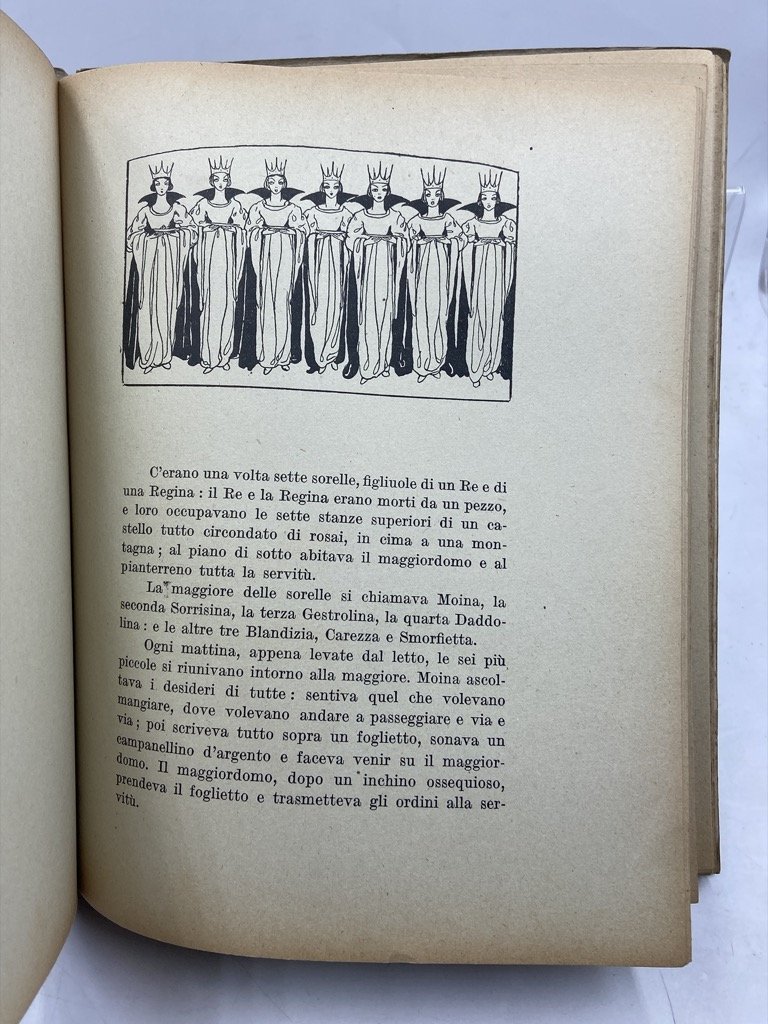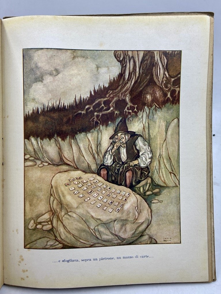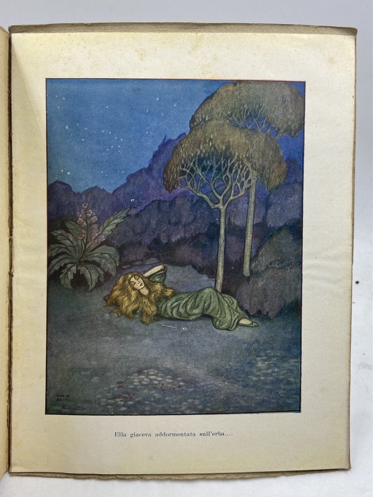 Brossura editoriale con titoli a stampa e illustrazione applicata sul piatto anteriore, cm 24 x 19.5, pp 139 (5), 8 tavole a colori, 32 figure in nero. Lievemente allentata la legatura, ordinari segni d’uso. Edizione originale, seguita da una seconda, di minor formato, del 1932, di questa raccolta di 16 favole di Dino Provenzal, insegnante (all’epoca preside della Scuola Normale femminile di Teramo ) e prolifico scrittore di libri per ragazzi e di numerose opere di divulgazione volte a rendere accessibile la bellezza della lingua e della letteratura italiana. Le novelle sono illustrate con delicato gusto tardo-liberty da Dario Betti (1891 - 1987), incisore fiorentino qui ad una delle prime prove di una lunga carriera di illustratore di libri per l'infanzia; oltre alla copertina e alle 8 tavole a colori ogni racconto è decorato da una vignetta in testa e un finalino in nero.