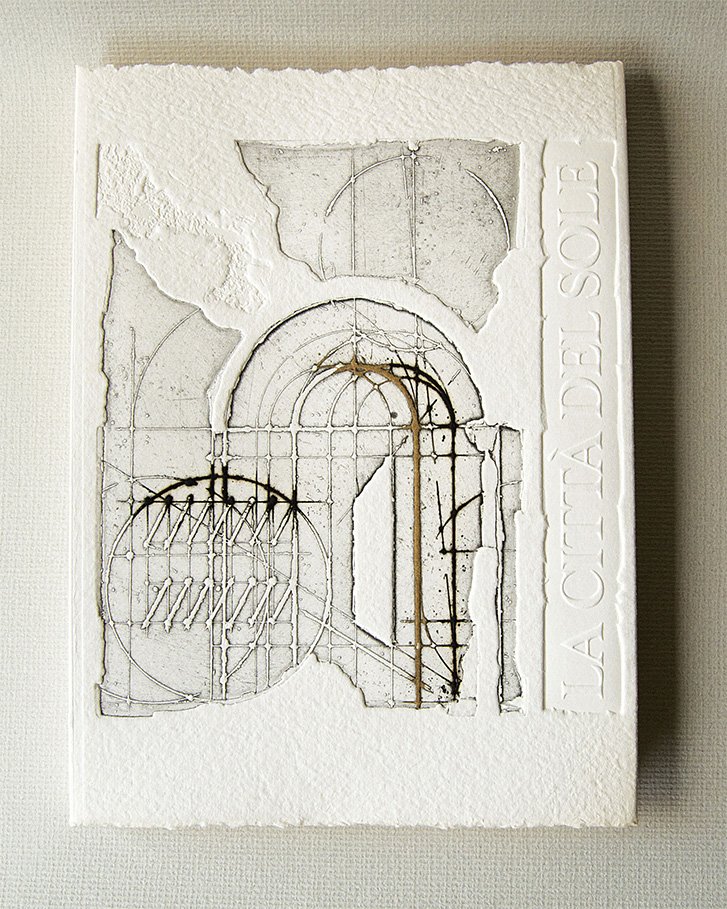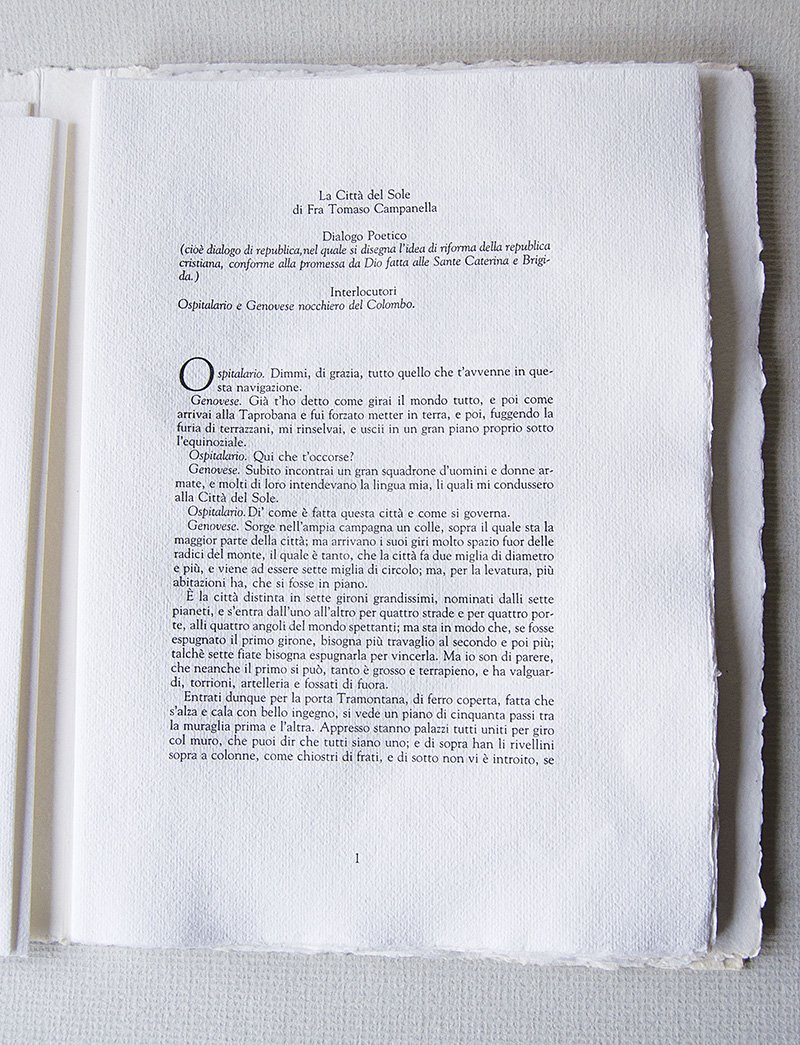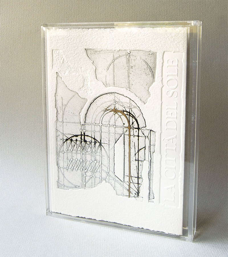- Legatura a fogli sciolti in custodia di plexiglass. 4 pagine bianche, 8 pagine non numerate, 29 (1) pp. di testo, colophon, 4 pagine bianche. L'opera comprende 2 incisioni originali, una concepita come copertina del libro, l'altra (firmata e numerata) è inserito dopo il testo (misure aperte 75,5 x 36 cm). Sono state impresse su torchio a mano su charta Duchene. Tiratura di 180 copie (90 in lingua italiana e XC in lingua ingliese).