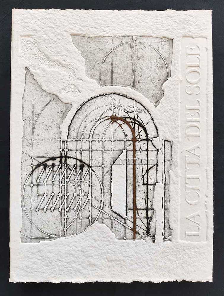 in 4° (39 x 29 cm. ca.); pp. (8), 32 + 1 tav. (ill. in bn. e col.); br. con astuccio. Traduzione di Luigi Firpo. Con 2 incisioni di Walter Valentini, una fuori testo e l'altra concepita come copertina del volume. Impaginazione di Walter Valentini. Le incisioni sono state impresse su torchio a mano da Giancarlo Sardella, su carta Duchene. I testi sono stati stampati dall'Istituto Grafico Bertieri di Milano. Colophon con numero della copia e firme a matita dell'editore e dell'illustratore. Opera in copertina non firmata; opera fuori testo con firma e numero a matita. Tiratura in 180 esemplari a fogli sciolti stampati su carta alcantara, firmati e numerati a matita dall’artista, da 1 a 90 in cifre arabe e da I a XC in cifre romane (ns. L). Il tutto raccolto in un'elegante custodia in plexiglas disegnata da P. Spallacci.