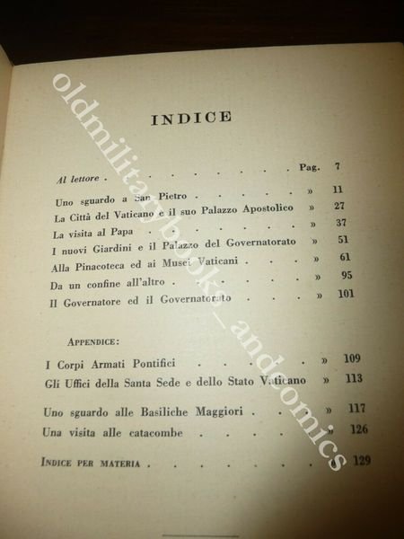 DESCRIZIONE: Aldo Chicca Tivoli 1935 V^ Ed., br. ed. ill. col., pp. 132 in 16° con una pianta e cinquanta illustrazioni f.t. Uno sguardo a San Pietro, la Città del Vaticano e il suo Palazzo Apostolico, la visita al Papa, alla Pinacoteca ed ai Musei Vaticani, da un confine all'altro, il Governatore e il Governatorato, i Corpi Armati Pontifici, uno sguardo alle Basiliche Maggiori, le Sacre Reliquie della Passione, le preghiere per acquistare il Santo Giubileo, le Indulgenze, ecc. CONDIZIONI: Ottime vol. INTONSO. Tracce di polvere. PESO / WEIGHT: 300 gr. without package