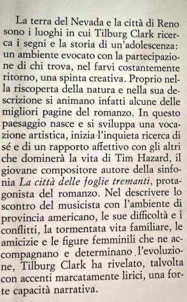 La terra del Nevada e la città di Reno sono i luoghi in cui Tilburg Clark ricerca i segni e la storia di un'adolescenza: un ambiente evocato con la partecipazione di chi trova, nel farvi costantemente ritorno, una spinta creativa. Proprio nella riscoperta della natura e nella sua descrizione si animano infatti alcune delle migliori pagine del romanzo. In questo paesaggio nasce e si sviluppa una vocazione artistica, inizia l'inquieta ricerca di sé e di un rapporto affettivo con gli altri che dominerà la vita di Tim Hazard, il giovane compositore autore della sinfonia La città delle foglie tremanti, protagonista del romanzo. Nel descrivere lo scontro del musicista con l'ambiente di provincia americano, le sue difficoltà e i conflitti, la tormentata vita familiare, le amicizie e le figure femminili che ne accompagnano e determinano l'evoluzione, Tilburg Clark ha rivelato, talvolta con accenti marcatamente lirici, una forte capacità narrativa.
