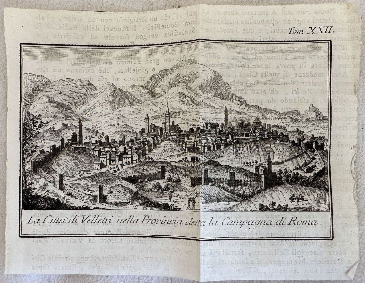 Veduta animata panoramica della città di Velletri nella Campagna di Roma. Atlante: Lo stato presente di tutti i popoli del mondo 1738-66 Autore: Thomas Salmon (1679-1767) Data: 1759 Tecnica: incisione su rame Dimensione del foglio: 172x130 mm Dimensione incisione: 154x96 cm Condizioni: Buone. Rare fioriture.Panoramic animated view of the city of Velletri. Atlas: Lo stato presente di tutti i popoli del mondo 1738-66 Autore: Thomas Salmon (1679-1767) Date: 1759 Technique: Copper etching Leaf Dimension: 172x130 mm Engraving Dimension: 154x96 cm Conditions: Good conditions. Occasional foxing.