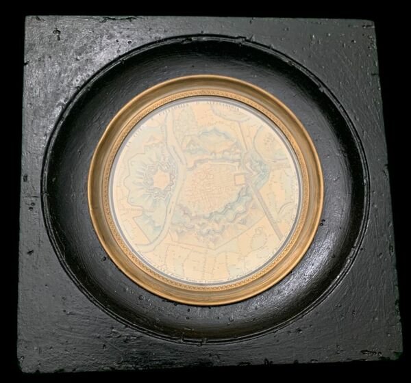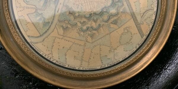 In tondo diametro di 9 cm; la stampa è montata su un cartoncino a sua volta inserito in una cornice in legno dipinta di nero, contornato all'interno da una cornice in ottone con una fine cornice incisa. Finissima acquarellatura a mano. Magnifica e fine incisione che illustra la città, cittadella e territorio circostante, d'Alessandria come appariva nel 1825. La carta, rarissima, venne realizzata da Paolo Burzio, noto ingegnere, architetto e topografo della città di Chieri e misuratore e disegnatore del 1° della città di Chieri e misuratore di 1° classe dello Stato Maggiore Generale dell'esercito sabaudo. Paolo Burzio, nel 1857, partecipò alla realizzazione del piano regolatore della città di Chieri. Esemplare in ottime condizioni di conservazione di carta rara.