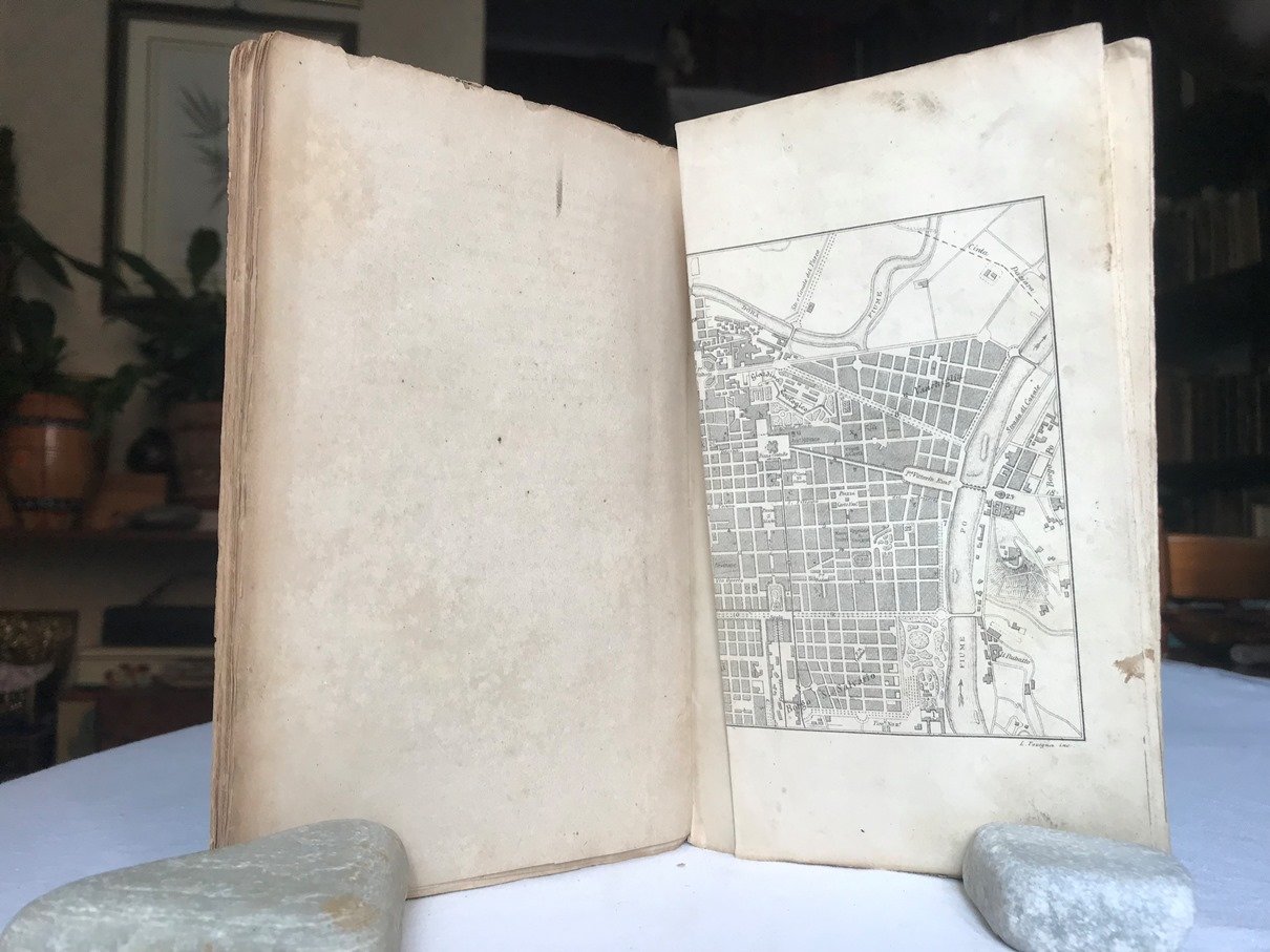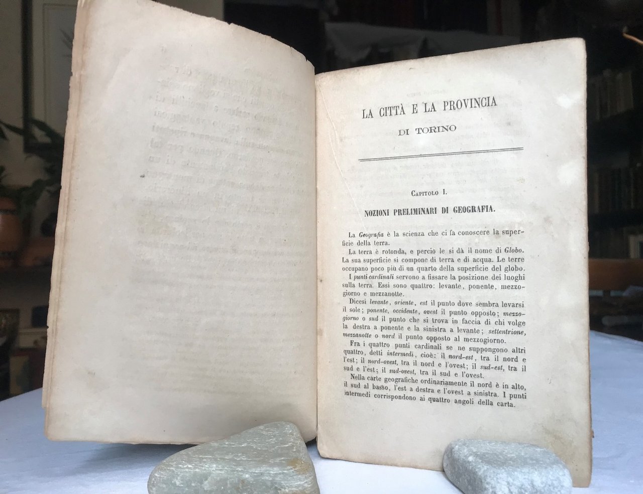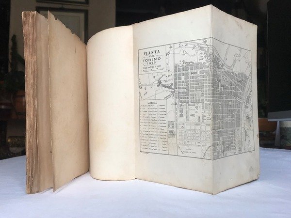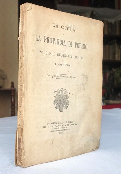 Volume in 8 privo di brossura ma completo delle carte, frontespizio, prefazione, 111 pp., 4 carte ripiegate ft., raffiguranti la Pianta di Torino, la Carta Topografica del Circondario, quella del Territorio di Torino e la Carta Topografica della Provincia. Piacevole saggio storico geografico arricchito da alcuni capitoli che accompagnano il lettore in 'passeggiata' attraverso piazze, vie e suggestivi scorci della citt, indicandone riferimenti storici e biografici. Malgrado l'assenza della brossura il volume in pi che buono stato di conservazione con solo una lieve e diffusa brunitura della carta. Interessante e piuttosto raro soprattutto completo delle carte.