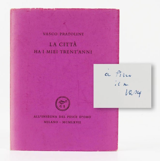 LIBROPrima edizione.CON AUTOGRAFO.Ottimo esemplare (sovracoperta in parte scolorita, come inevitabile, particolarmente al dorso). Dedica autografa dell’autore: «A Paolo con l’affetto del suo Vasco»Plaquette edita da Scheiwiller nel 1967 in 1050 esemplari non numerati, con componimenti originariamente composti tra il 1943 e il 1944 così presentati dallo stesso Pratolini: «Tra il novembre 1943 e il maggio 1944, durante l’occupazione tedesca di Roma, stesi questi appunti in versi che in seguito perfezionai. Ancora oggi vi ascolto l’eco tutta privata d’una breve stagione della vita, forse la più felice. Con questo spirito li riunisco. Due componimenti, il primo e l’ultimo, già li avevo pubblicati in un numero de “Il Contemporaneo” dell’estate 1955».