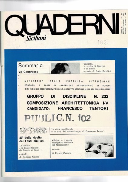 La città meridionale e le città del sottosviluppo. Segue di Vincenzo Pino La storia del San Berillo: blocco di potere urbano e investimento pubblico a Catania. segue di Renato Guttoso la terreste immortalità di Picasso. Articoli contenuti nella rivista Quaderni Siciliani n° 5-6 mag-giu. 1974.