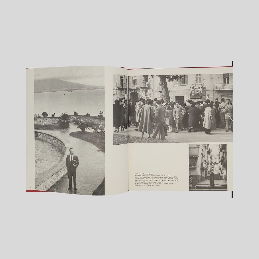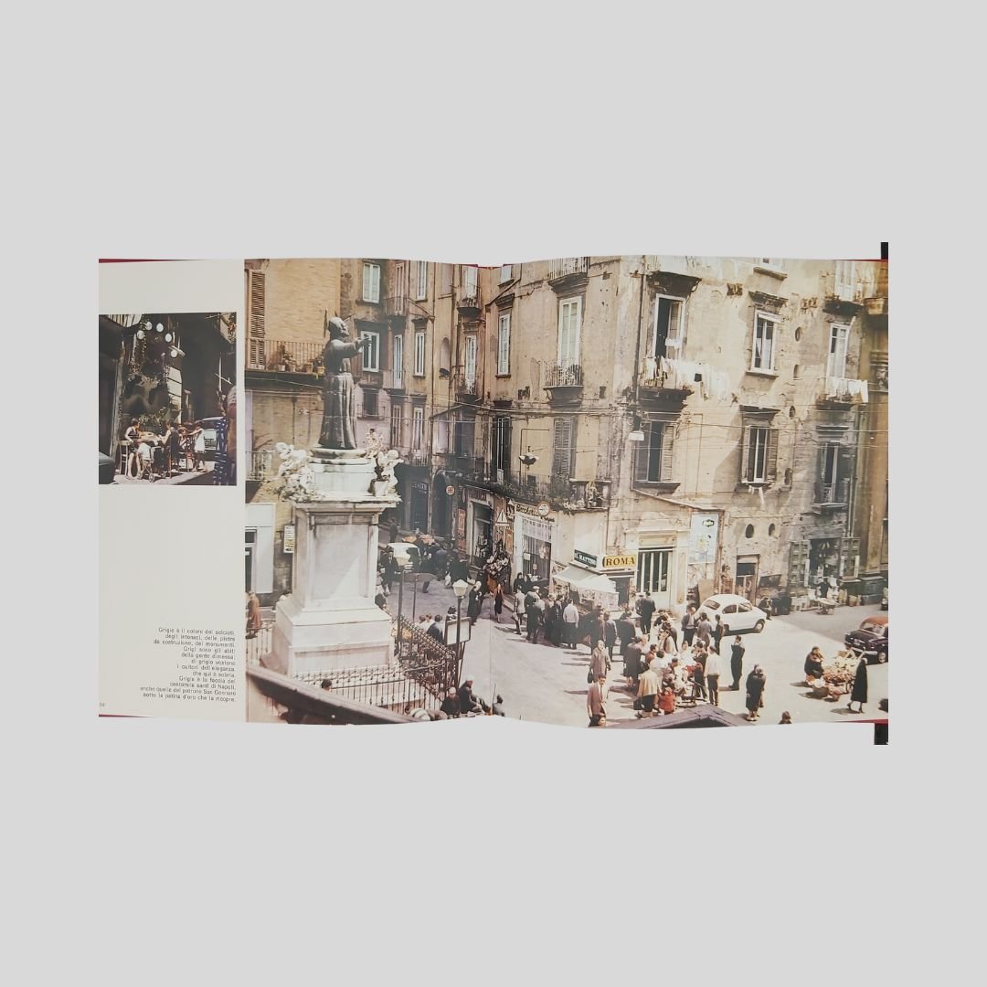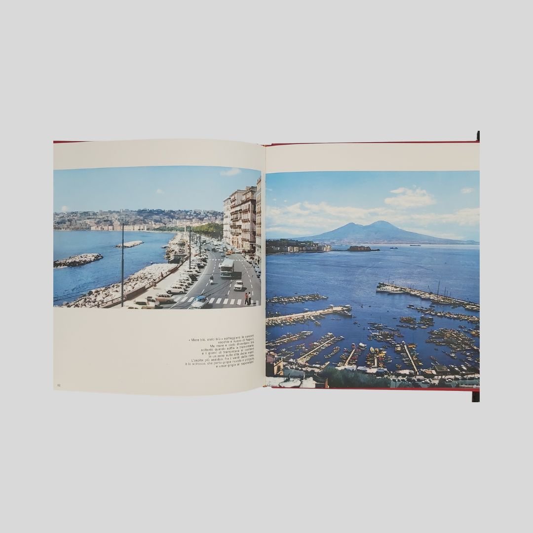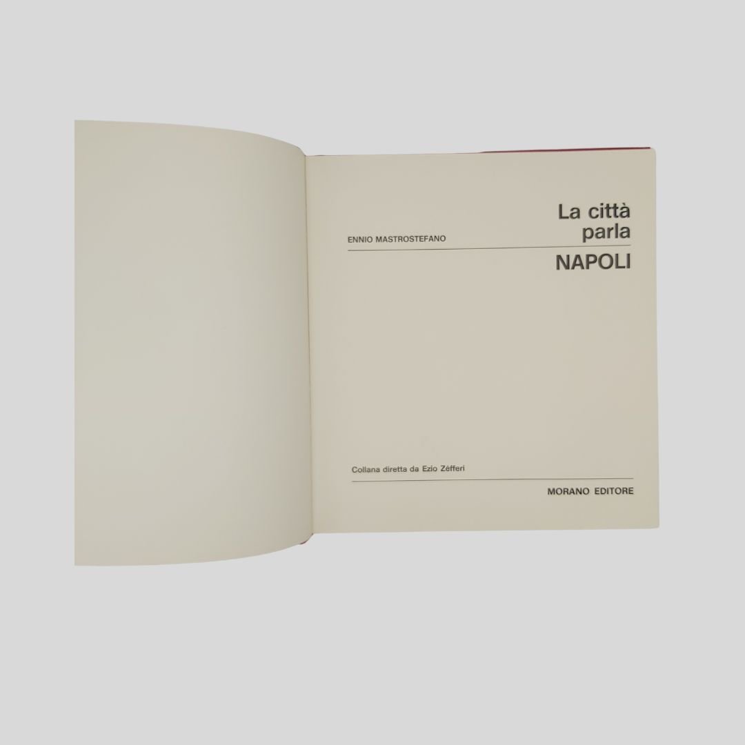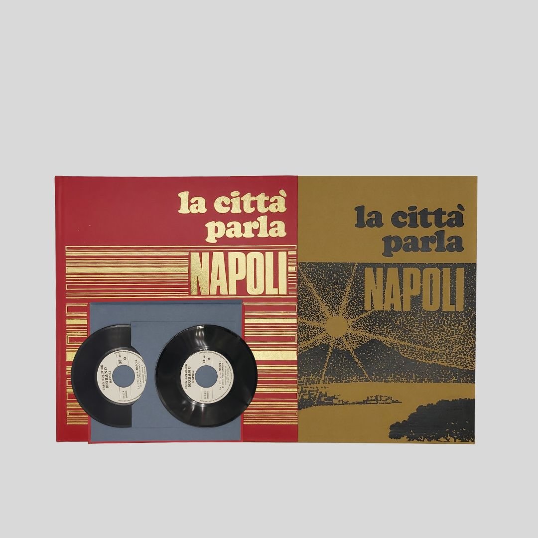 In-8° gr. (cm 27) carrè, pp.150, leg. edit. similpelle rossa, tit. e fregi in oro, con numer. ill. fotogr. a c. e in b.n. Allegati 2 dischi in vinile a 33 giri. Cofanetto. In ottome condizioni, come nuovo. Non comune. Un caleidoscopio scandito da centinaia di immagini a colori e in bianco e nero: Napoli per sé e per gli altri. L’economia del vicolo. Fotocronaca della Napoli dell’800. Oggi, domani e ancora ieri. Le mani sulla città. Un prezioso e raro documento della città alla fine degli anni ’60, a ridosso dei ’70. La città della cultura, dello sport, della disoccupazione, dell’oleografia, del “sacco edilizio”, della speranza. I dischi contengono interviste ai personaggi più in vista della città.<BR><BR>La notte della città spinge alla fuga, all’emigrazione. La notte finirà quando un giovane napoletano, intellettuale, o operaio, arrivato qui, davanti al treno che dovrebbe portarlo in un’latra città, città, deciderà improvvisamente di rimanere. Ma oggi, nell’anno di grazia 1969, l’alba sembra ancora lontana.
