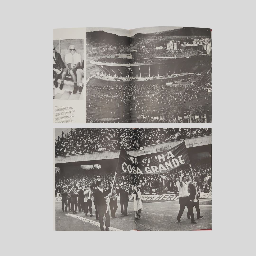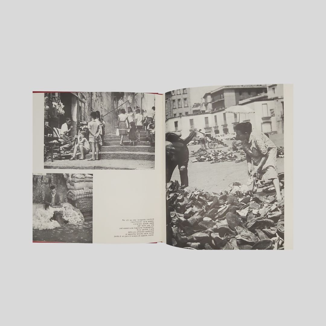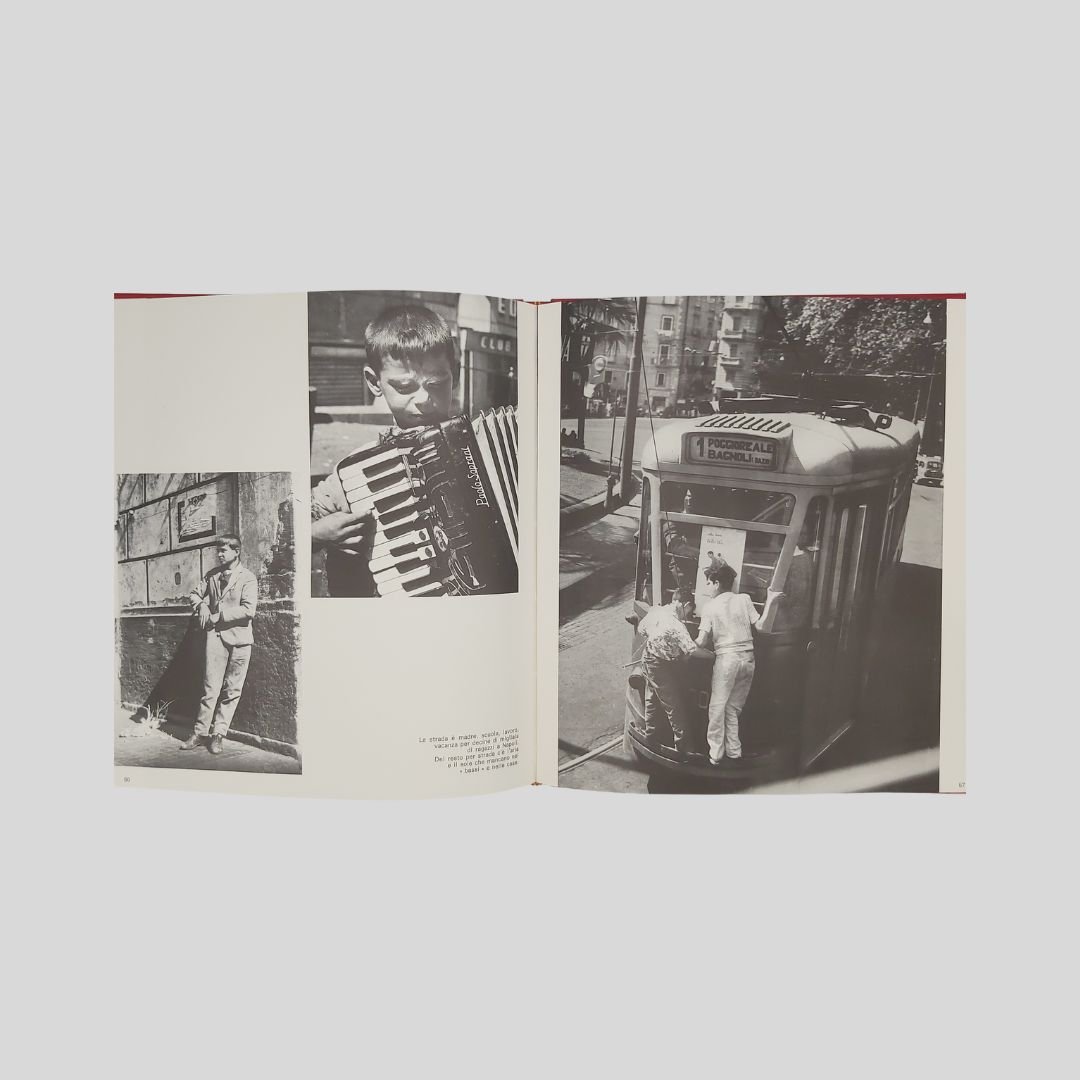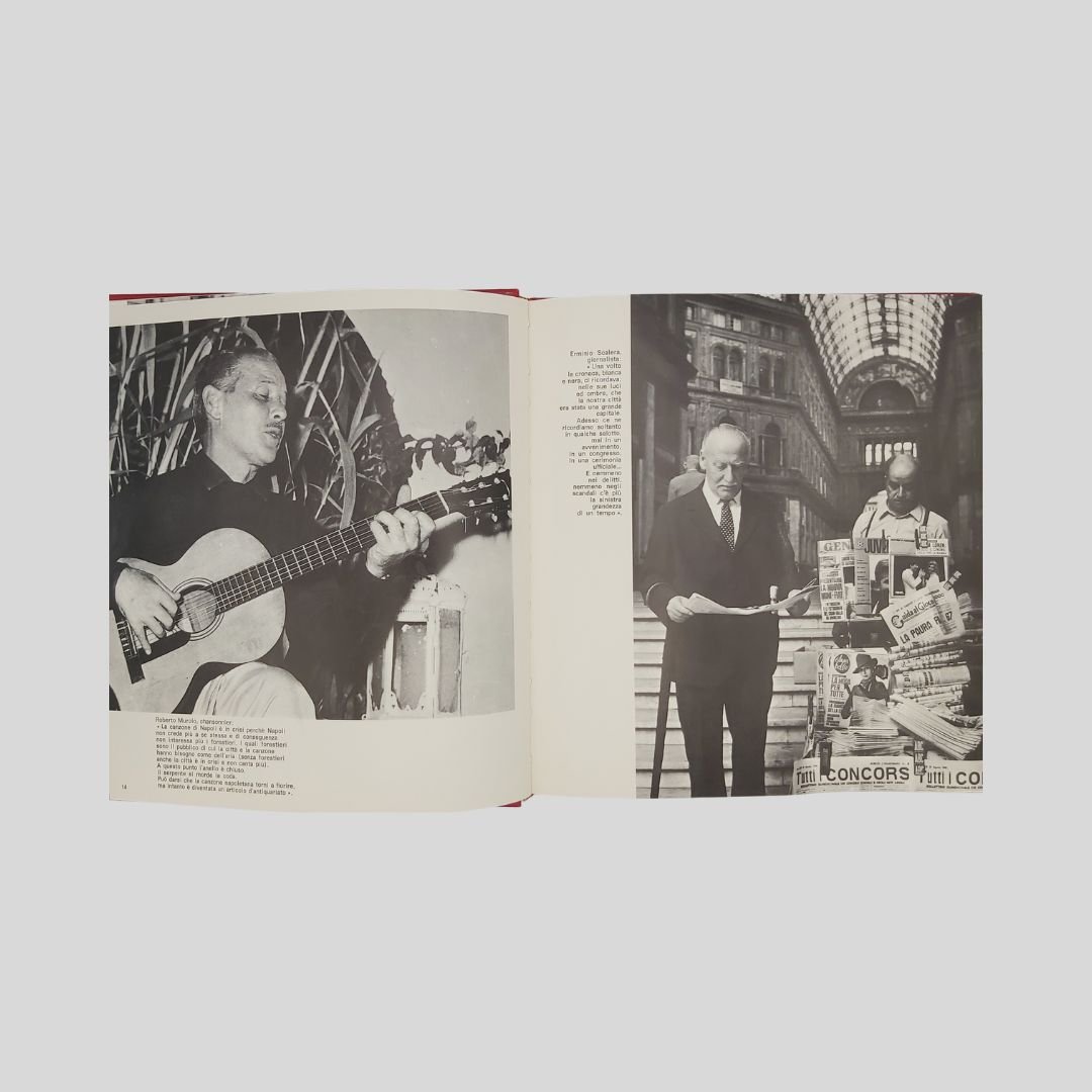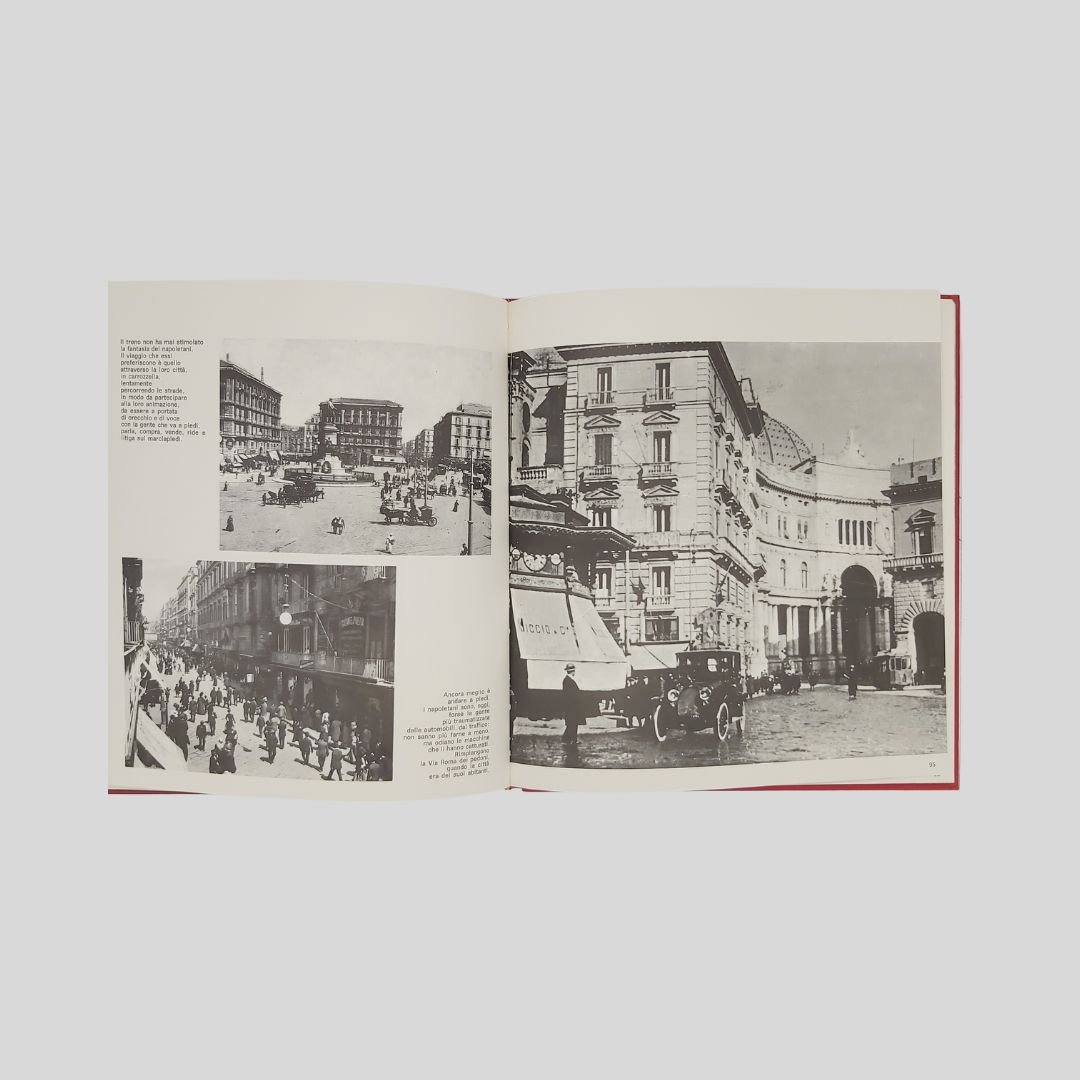 In-8° gr. (cm 27) carrè, pp.150, leg. edit. similpelle rossa, tit. e fregi in oro, con numer. ill. fotogr. a c. e in b.n. Allegati 2 dischi in vinile a 33 giri. Cofanetto. In ottome condizioni, come nuovo. Non comune. Un caleidoscopio scandito da centinaia di immagini a colori e in bianco e nero: Napoli per sé e per gli altri. L’economia del vicolo. Fotocronaca della Napoli dell’800. Oggi, domani e ancora ieri. Le mani sulla città. Un prezioso e raro documento della città alla fine degli anni ’60, a ridosso dei ’70. La città della cultura, dello sport, della disoccupazione, dell’oleografia, del “sacco edilizio”, della speranza. I dischi contengono interviste ai personaggi più in vista della città.<BR><BR>La notte della città spinge alla fuga, all’emigrazione. La notte finirà quando un giovane napoletano, intellettuale, o operaio, arrivato qui, davanti al treno che dovrebbe portarlo in un’latra città, città, deciderà improvvisamente di rimanere. Ma oggi, nell’anno di grazia 1969, l’alba sembra ancora lontana.