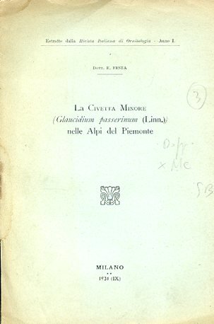 In-8°, pp. 15-17, brossura editoriale. Una tav. fotografica n.t. Estratto dalla 'Rivista Italiana di Ornitologia', anno I.