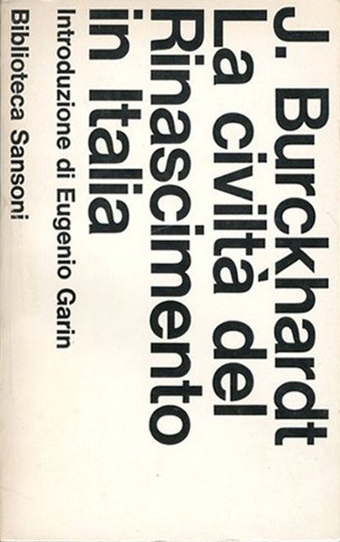 Nuova ed. riveduta e corretta. XXXV, 543 p. ; 20 x 12 cm. Quest'opera che può essere considerata il capolavoro di Jacob Burchardt, è alla base della discussione sul concetto del Rinascimento e sulle relazioni di questo con il Medioevo. Titolo originale dell'opera: "Die Kultur der Renaissance in Italien". Traduzione dal tedesco Diego Valbusa. Introduzione di Eugenio Garin. Brossura editoriale, coperta in cartoncino flessibile di colore bianco plastificato lucido. Codice libreria 629.