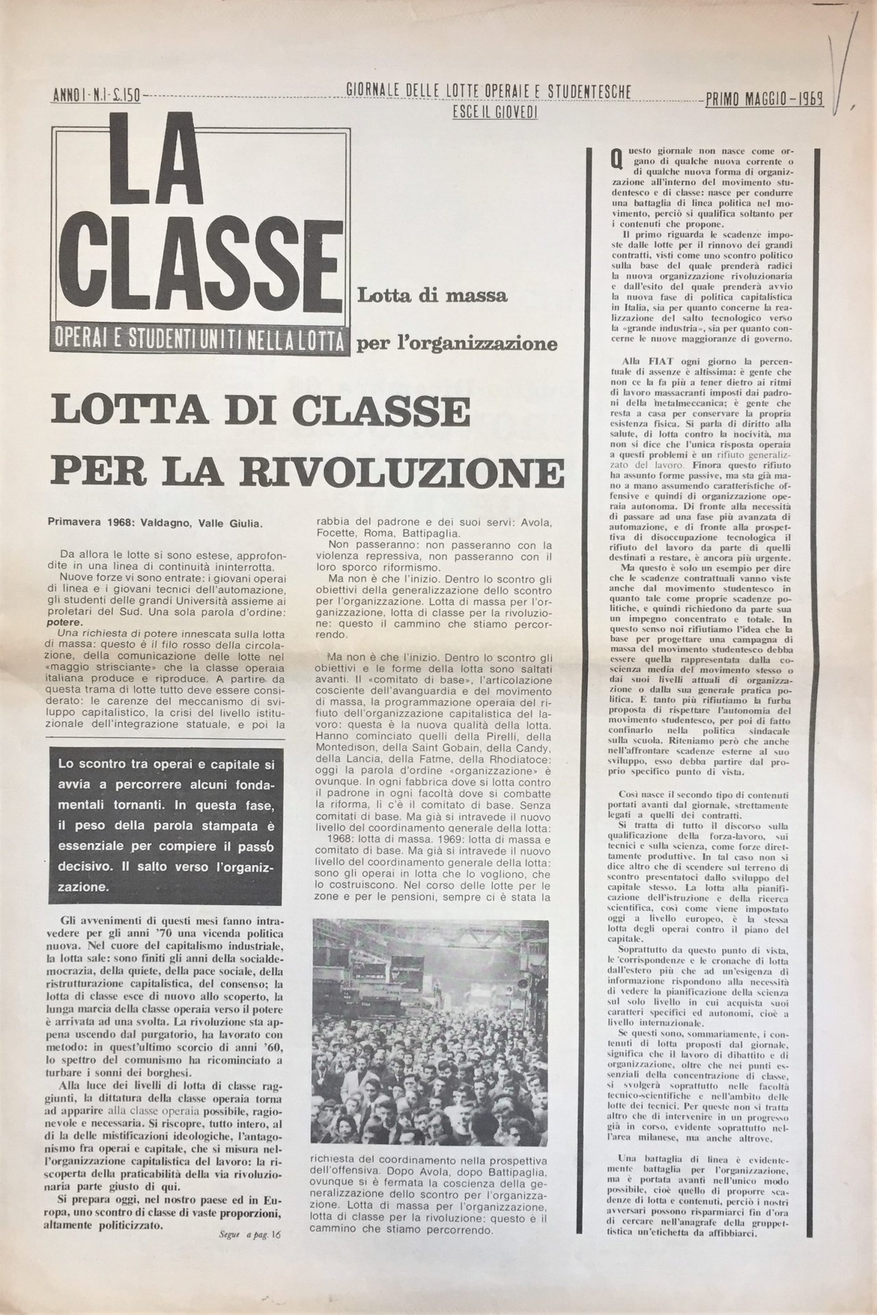 La Classe. Operai e studenti uniti nella lotta. Giornale delle lotte operaie e studentesche. Esce il giovedì. Anno I No. 1. 1 Maggio 1969