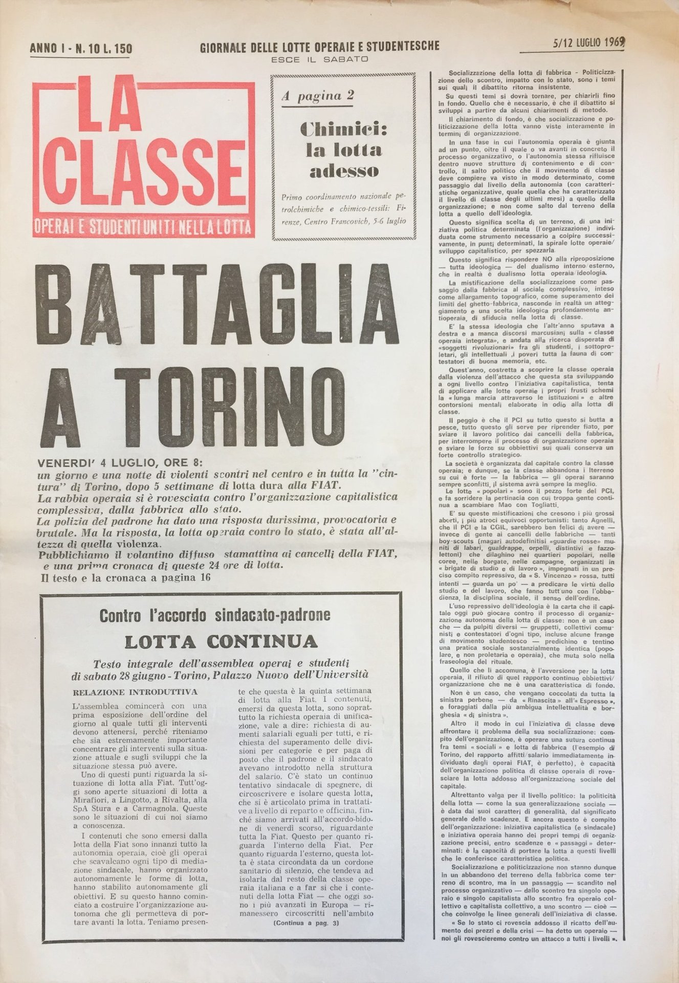 La Classe. Operai e studenti uniti nella lotta. Giornale delle lotte operaie e studentesche. Esce il sabato. Anno I No. 10. 5/12 Luglio 1969