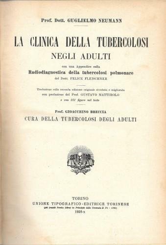 in 8°, pp. XV, 798, p/tela edit. nera; "Con una Appendice sulla Radiodiagnostica della tubercolosi polmonare del dott. Felice Fleischner, e Cura della tubercolosi degli adulti del prof. Gioacchino Breccia", traduz. del prof. Gustavo Mattirolo; con 221 ill. b/n n.t. 039/36