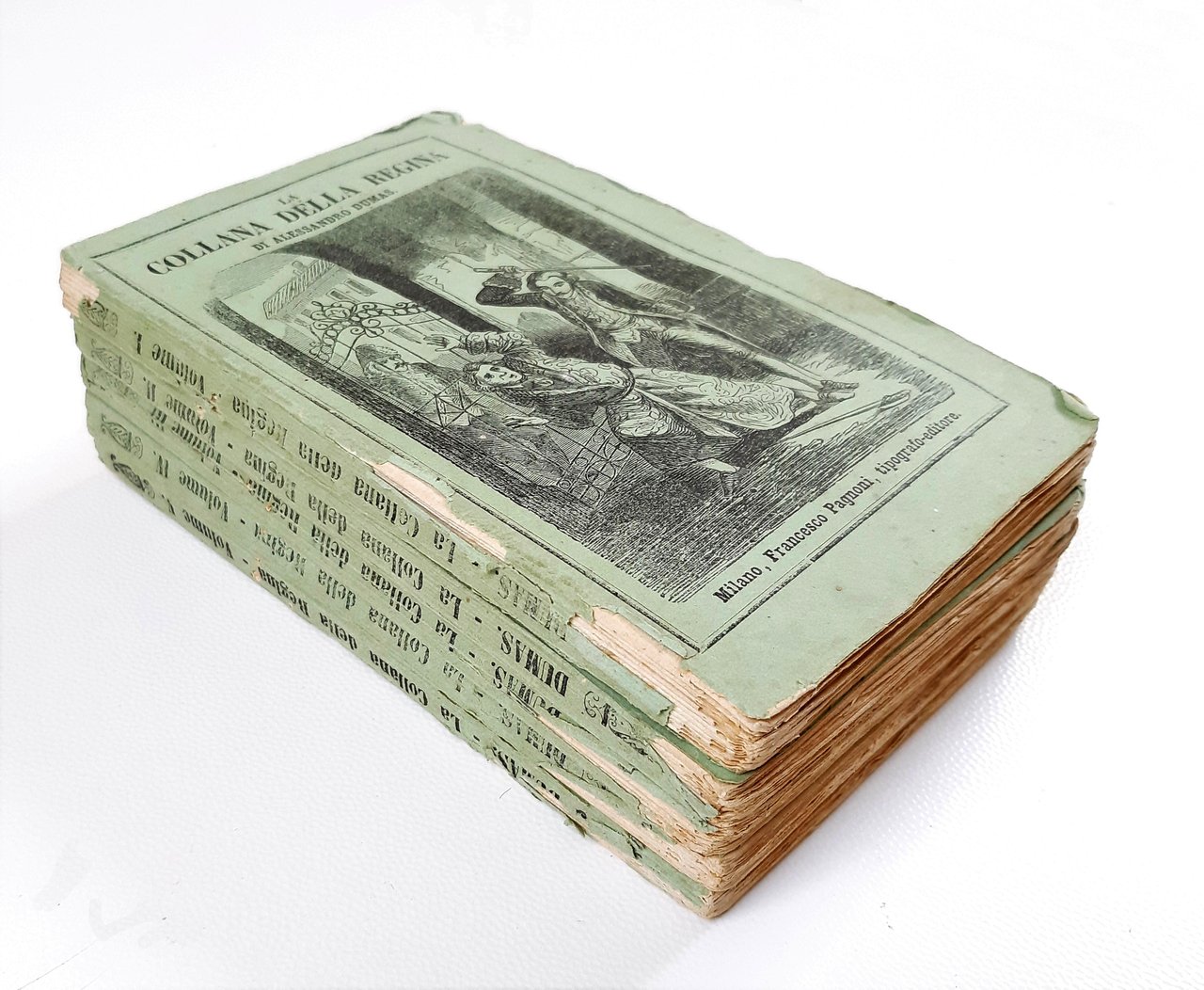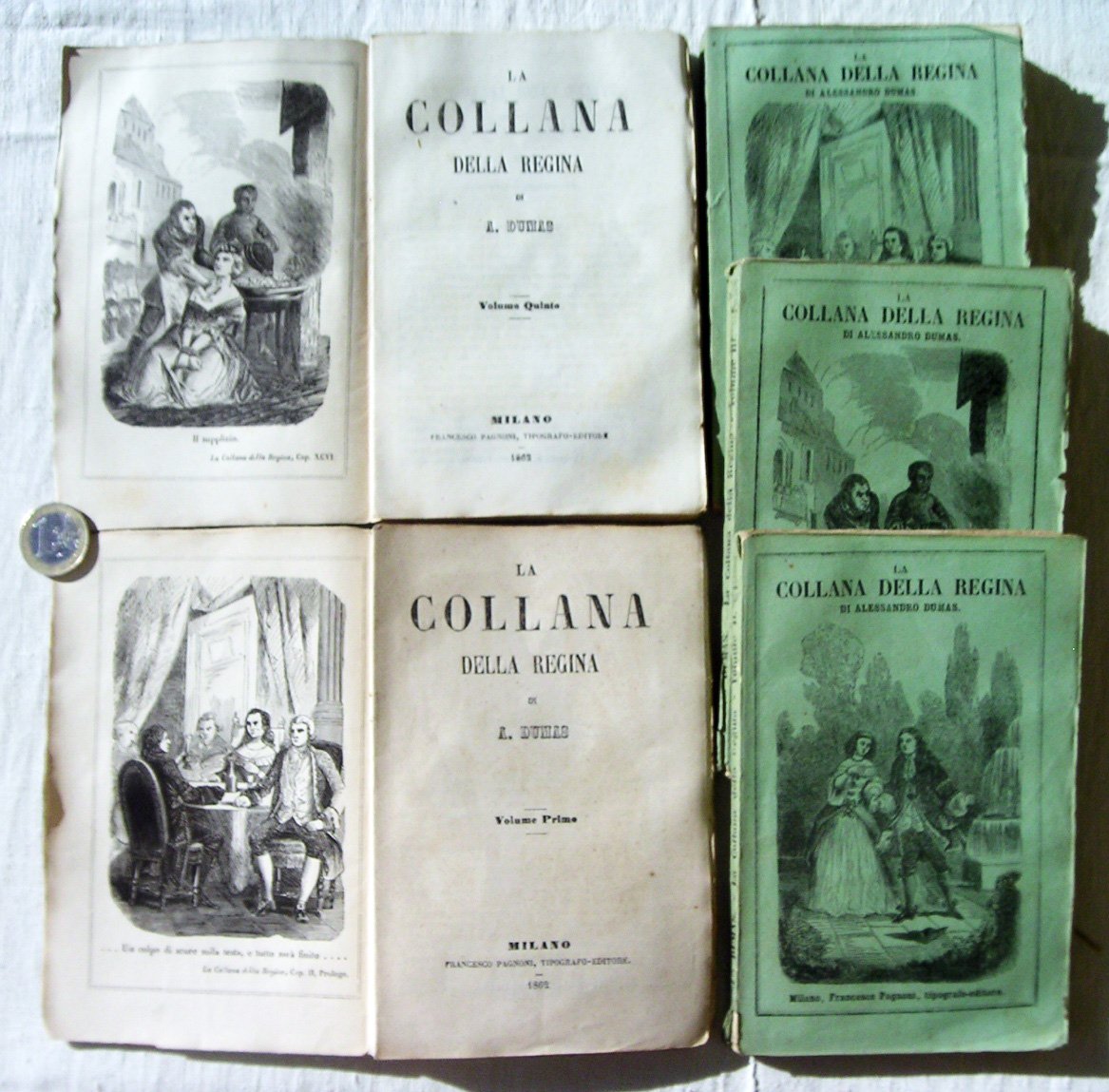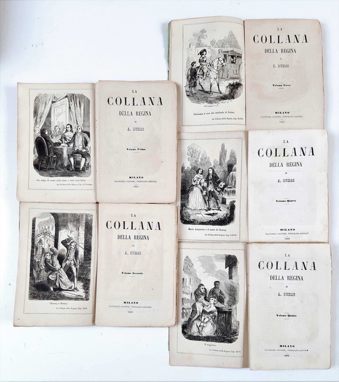 in-8° piccolo ( 15,5 x 10 cm); 5 volumetti; pp. 189, (1 b.), (1), (1 b.); 155, (1 b.), (1), (1 b.); 164; 156; 174; leg. in brossura editoriale con coperta in carta azzurra con titolo a caratteri neri ed illustrazione al piatto ant. (una per ciascun volume) all'interno di cornice a doppio filetto nero, titolo a caratteri neri al dorso, pubblicità editoriale al piatto post., frontespizio a caratteri neri, incisione all'antiporta di ogni volume. Rif.: IT\ICCU\LO1\0921910. Cond.: tracce d'uso (legatura lenta, piccoli strappi e piccole pieghe alla coperta, carta della coperta staccata in alcuni punti dal dorso), tagli delle pagine irregolari; opera in buone condizioni generali.