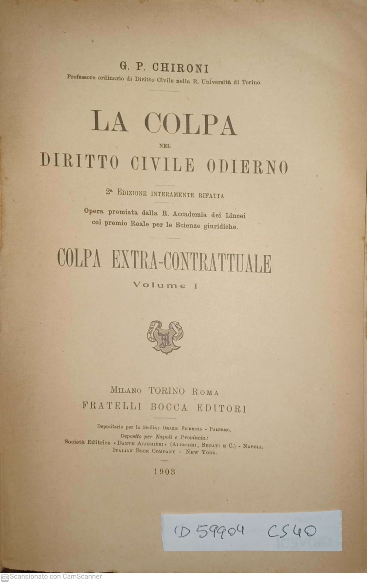 Opera premiata dalla R. Accademia dei Lincei - volume 1 - DETTAGLIO DELLE CONDIZIONI : Volume in buono stato. La copertina mancante è stata sostituita con carta da pacchi incollata al dorso - (1.XV.2).