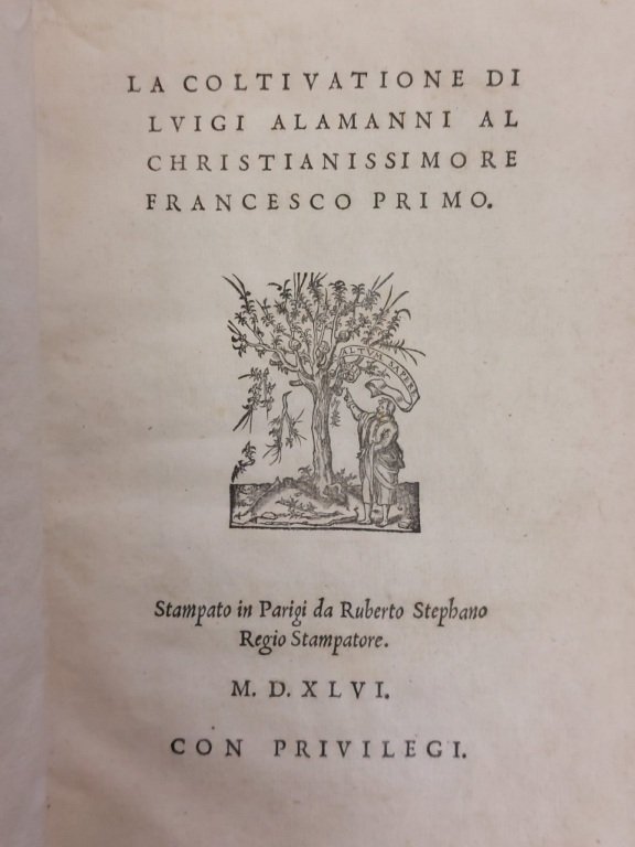 <span style="font-style: normal;">In-4° piccolo (cm. 20,1), legatura settecentesca in piena pergamena (tasselli con mancanze), tagli spruzzati; cc. 154 [2] in stato molto buono, con marca di Estienne al frontespizio e testo in elegante Garamond (mancano le 2 carte finali con il privilegio di </span><i>François Roy de France</i>; leggere fioriture sparse. Edizione originale del celebre poema didascalico scritto dal poeta fiorentino durante il suo forzato soggiorno in Francia. L'opera letteraria tratta di agricoltura, agraria, apicoltura ed è citata nei repertori gastronomici. Assai interessante. «Gli esemplari perfetti non debbono mancare di carte 4 al fine non numerate» [Gamba 17]. In stato molto buono. (SL4)