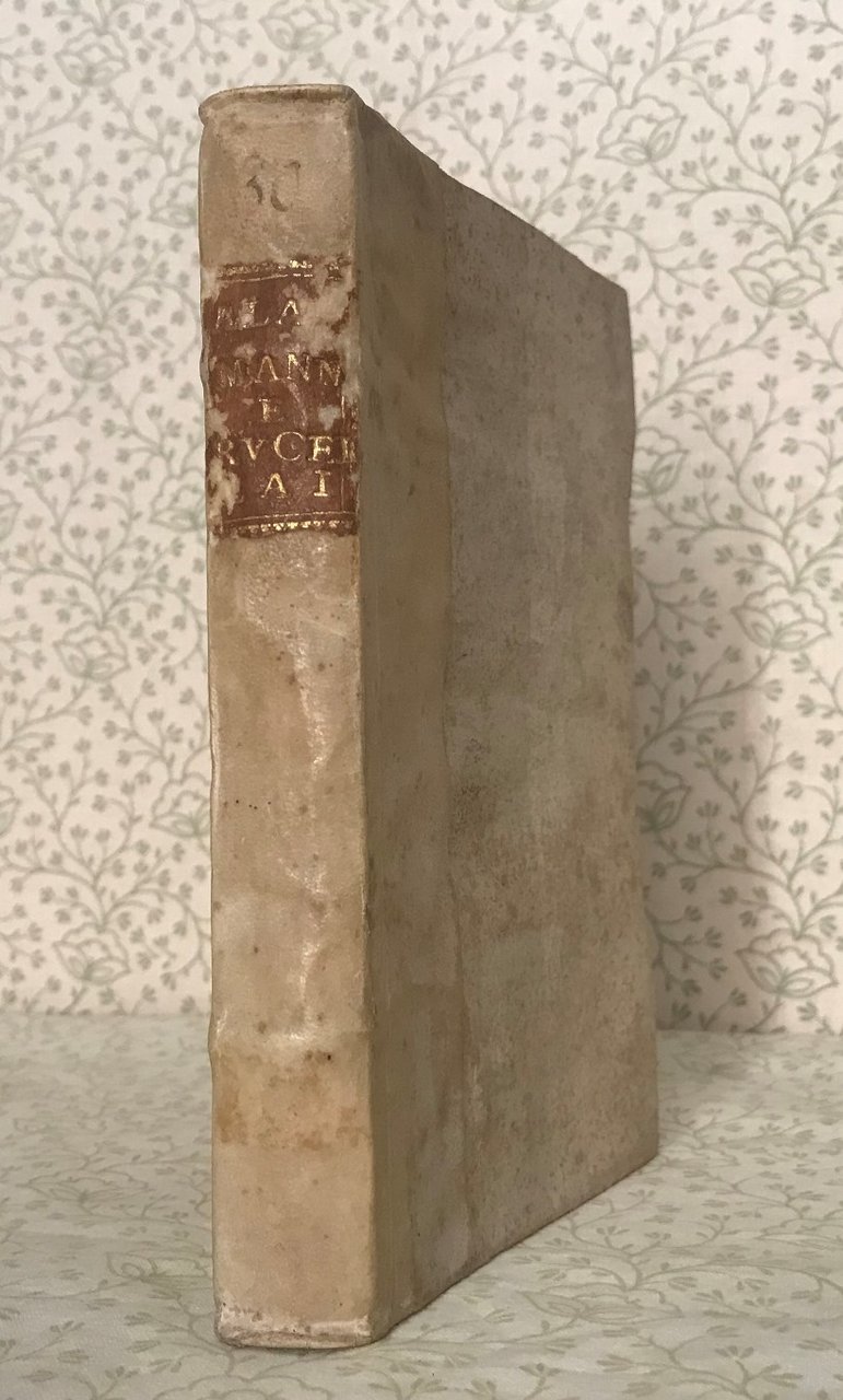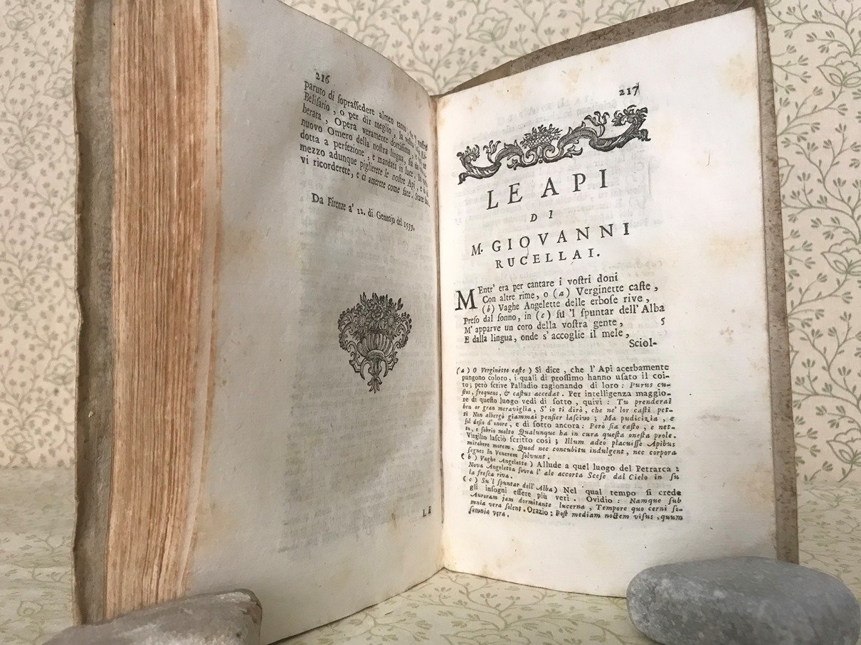 Volume in 8, legatura coeva in mezza pergamena, titolo al tassello l dorso, antiporta con ritratto dell'Alamanni inciso su rame entro ovale, frontespizio stampato in rosso e nero con piccola vignetta calcografica con scene agresti, 100 pp., 1 carta d'occhiello, 280 pp., capilettera istoriati e testatine ornate in xilografia. Prima edizione remondiniana di questi due celebri poemi classici sull'apicoltura e sulla coltivazione. Alla vita dell'Alamanni scritta da Giammaria Mazzucchelli (per le prime 74 pp.), seguono alcune notizie e testimonianze biografiche sul Rucellai di uomini illustri e la 'Lettera del signor Giovanni Checozzi, Vicentino al Dottore Gianantonio Volpi nella quale si difende il celebre Giovangiorgio Trissino, e si spiega un luogo difficile delle Api del Rucellai. Volume in ottime condizioni, carta bianca, lievissime e sporadiche fioriture, ampi margini. Edizione poco comune.
