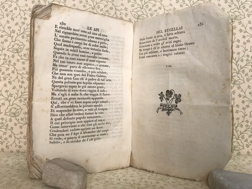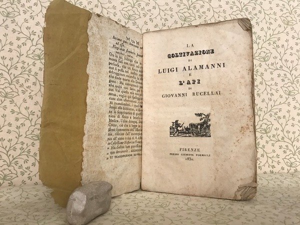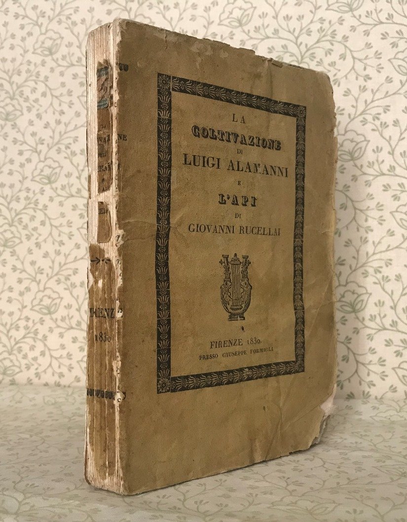 Volume in 8, brossura editoriale, titolo inquadrato da cornice ornamentale al piatto ed al dorso, frontespizio con bella vignetta silografica (scena pastorale), riportate le dedicatorie di Alamanni alla serenissima madama la Delfina e di Rucellai a Giovan Giogio Trissino, 231 pp., graziosi finalini silografici. I due classici sull'apicoltura e sulla coltivazione in una bella edizione del Formigli. Volume in pi che buone condizioni interne, carta bianca, lievissime e sporadiche fioriture, ampi margini originali, legatura stanca e con qualche mancanza al dorso.