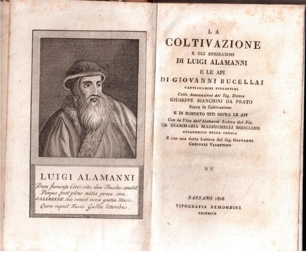 La coltivazione e gli epigrammi di Luigi Alamanni e Le api di Giovanni Rucellai, gentiluomini fiorentini colle annotazioni del Sig. Dott. Giuseppe Bianchini da Prato sopra la Coltivazione e di Roberto Titi sopra le api Con la vita dell'Alamanni scritta dal Sig. Giammaria Mazzuchelli bresciano,Accademico dela Crusca e con una dotta Lettera del Sig. Giovanni Checozzi vicentino