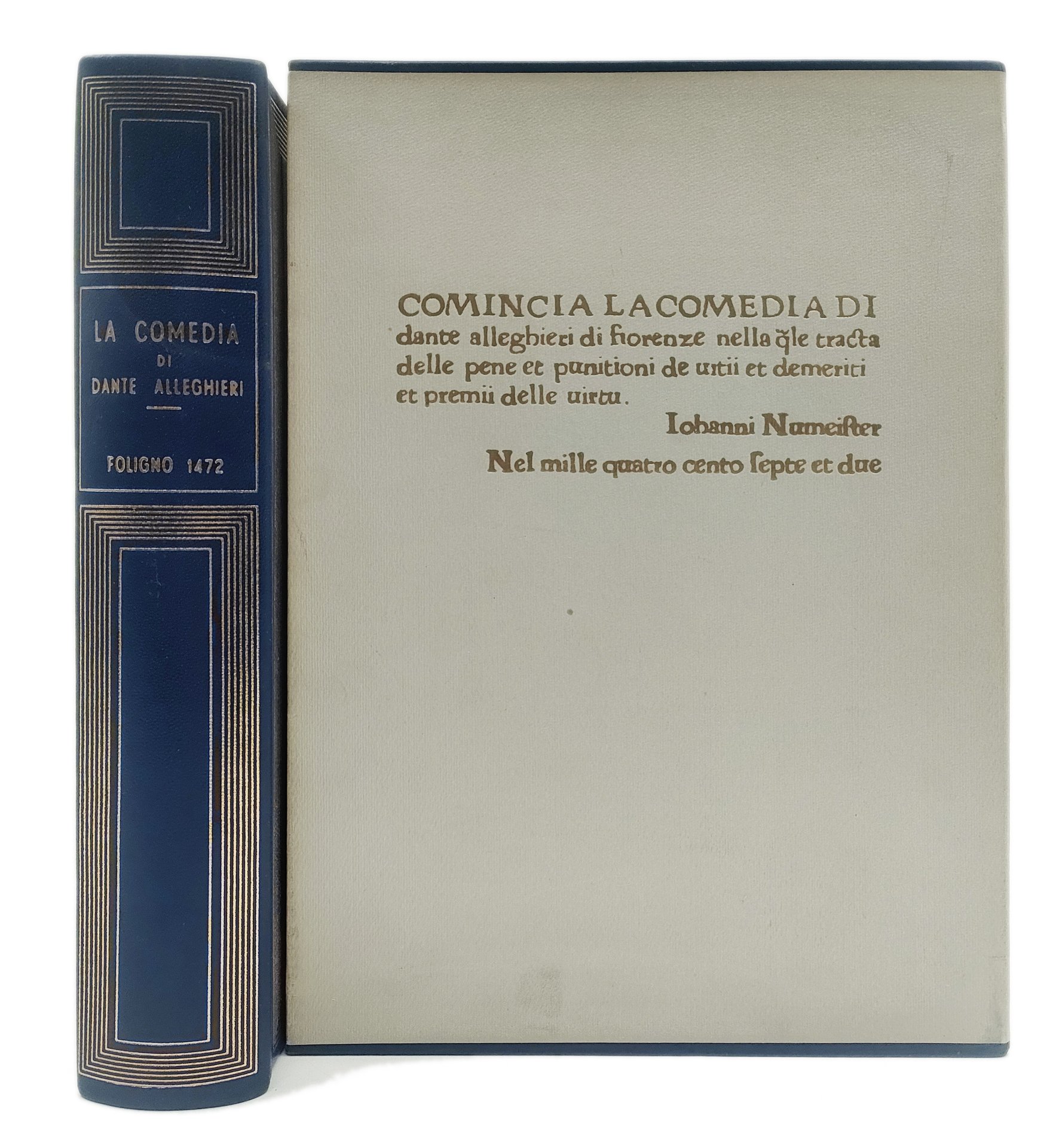 Facsimile dell’esemplare Corsiniano della prima edizione della Divina Commedia stampata a Foligno l’11 aprile 1472 da Johann Numeister ed Evangelista Angelini da Trevi. Es. 353 su una tiratura complessiva a 1000 copie. Legatura in piena pelle blu con cornice di filetti impressa in oro ai piatti e titoli dorati al dorso. Entro custodia editoriale in cartonato con incipit impresso in oro al piatto anteriore.