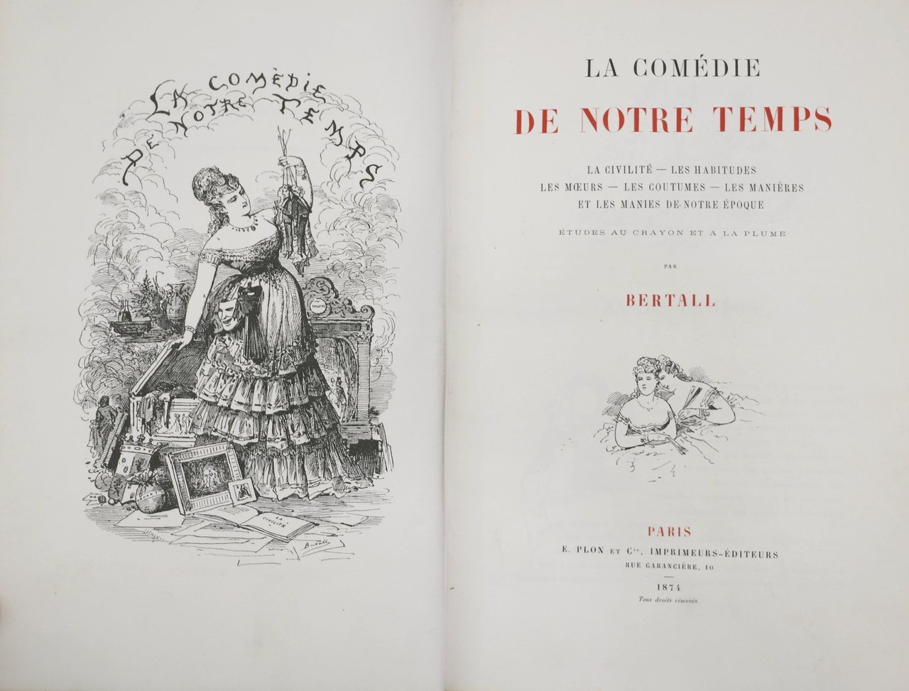 In-8 gr. (mm. 272x189), 3 volumi, mz. marocchino coevo (tre legature differenti), dorso a cordoni con titolo oro. L'opera è così composta: I vol.: La civilté. Les habitudes. Les moeurs. Les coutumes. Les manières et les manies de notre époque, pp. 651.II vol.: Les enfants. Les jeunes. Les murs. Les vieux, pp. 652.III vol.: La vie hors de chez soi: Les chemins de fer - En chemin de fer - Voyages et voyageurs, en Hiver, Printemps, Eté, Automne, pp. 667.I volumi sono interamente illustrati dai piacevolissimi disegni di Bertall, autore anche del testo: "je désire faire de tous ces croquis une sorte d'esquisse générale de notre temps.. pas de drame, de la comédie seulement, avec une pointe de vaudeville". "Edizione originale".Cfr. Carteret,III,89 - Benezit,I,687: "Bertall, pseudonyme d'Albert d'Arnoux (Paris 1820-82), fut un des illustrateurs plus féconds de la deuxième partie du XIX siècle". Esemplare molto ben conservato.