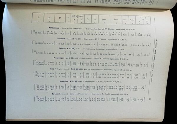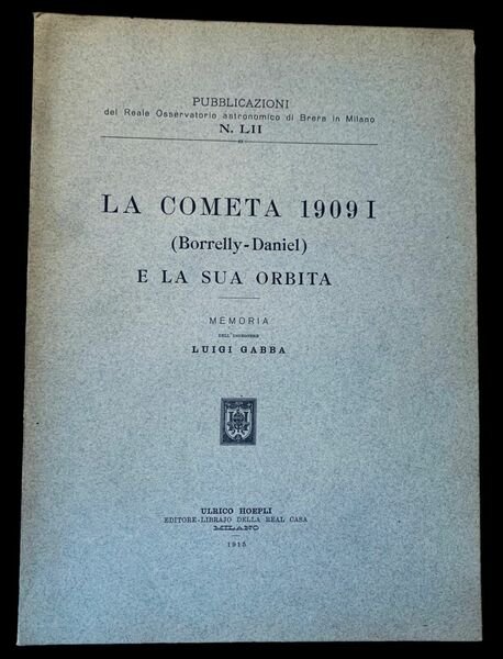 In folio; 44 pp. Brossura editoriale con titolo, autore, editore e anno di stampa, impressi in nero al piatto anteriore. Esemplare in ottime condizioni di conservazione. Prima edizione di questa importante monografia dedicata alla cometa 1909I la Borrelly-Daniel, scritta dal celebre astronomo e accademico italiano, Luigi Gabba (Torino, 18 dicembre 1872 Borgomanero, 28 settembre 1948). Lautore, laureatosi a Torino in ingegneria, iniziò, subito dopo la laurea, ad interessarsi ad astronomia frequentando gli osservatori astronomici di Torino, lavorando sotto, Lorenzo Porro e poi anche quello di Roma. Nel 1901 entrò alla Specola di Brera con la qualifica di assistente incaricato di Giovanni Celoria. Dal 1917 al 1921 divenne direttore della specola di Brera aggiornandone ed aumentandone notevolmente la strumentazione scientifica, aggiungendo anche apparecchi geodetica e meteorologici, aumentando la biblioteca dellistituto. Nel 1824 divenne professore dastronomia e lanno dopo astronomo effettivo della Specola di Brera. Nel 1826, vincendo un concorso, assunse, anche, la direzione dellOsservatorio astronomico di Teramo. Durante la sua vita insegnò anche allUniversità di Milano e a quella di Pavia. Gabba fu autore prolifico scrisse di astronomia sferica ed osservativa, astrometria e meccanica celeste ma anche di storia dellastronomia. Lopera qui presentata, è la rarissima e dotta dissertazione con la quale Gabba presentò i suoi studi sulla cometa 1909I. La C/1909 L1 (Borrelly-Daniel) è una cometa non periodica, scoperta il 14 giugno 1909 dallastronomo francese Alphonse Borrelly ed il 15 giugno 1909 dallastronomo statunitense Zaccheus Daniel. Il 14 giugno 1909 la cometa era di 10,5a, il 18 giugno 1909 raggiunse la 9a, l8 luglio 1909 il suo nucleo era di 13a. Copia rara, un solo esemplare censito in ICCU, ed in perfette condizioni di conservazione. Rif. Bibl.: IT\ICCU\LO1\1369632.