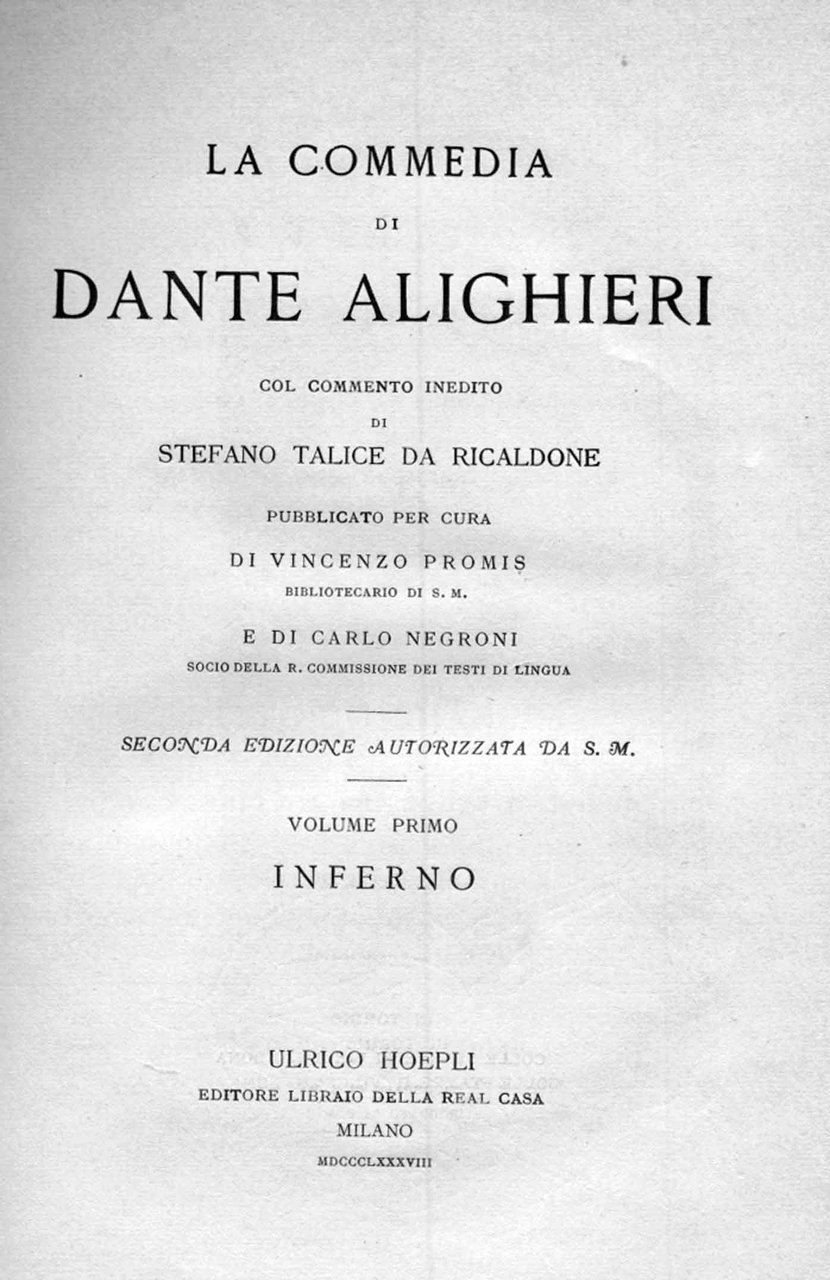 In-8 p. (mm. 220x144), 3 volumi, tela moderna, sovracoperta stampata in facsimile, custodia, pp. LXVI,462; 440; 485; con un ritratto di Dante inc. all'acquaforte da Domenico Promis. Cfr. Mambelli,436: Seconda edizione, stampata da Hoepli (Tipogr. Bona), su carta giallina. Il commento del Talice fu tolto da un codice cartaceo di scrittura della seconda metà del XV sec., scoperto a Torino nella Biblioteca del Re Umberto I, che ne autorizzò la stampa. Tale commento, sconosciuto fino al 1884 ai più diligenti dantisti, era stato nel 1886 pubblicato in ediz. fuori commercio. Esempl. ben conservato.